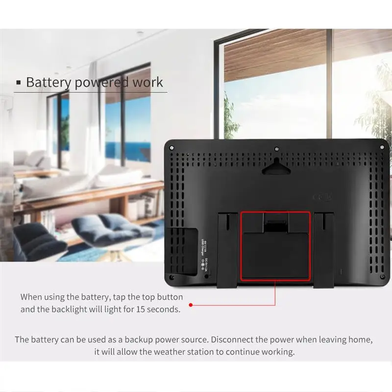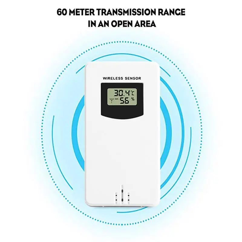 Датчик температуры на открытом воздухе с кронштейном и подвесным отверстием, разработанным на спине, можно легко установить на стену или разместить на столе. Датчик температуры на открытом воздухе питается от батарей, нет ограничений на кабель питания, удобно устанавливать.