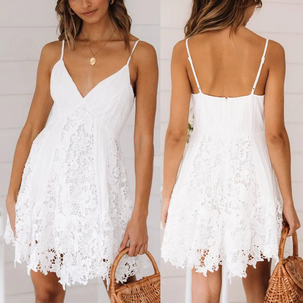 Особенности: открытая спина, без рукавов, однотонный, v-образный вырез, кружево, а-силуэт, мини-платье, пляжный стиль, вечерние платья, платье-майка, сексуальная одежда, платье с цветочным рисунком, летнее и весеннее платье.