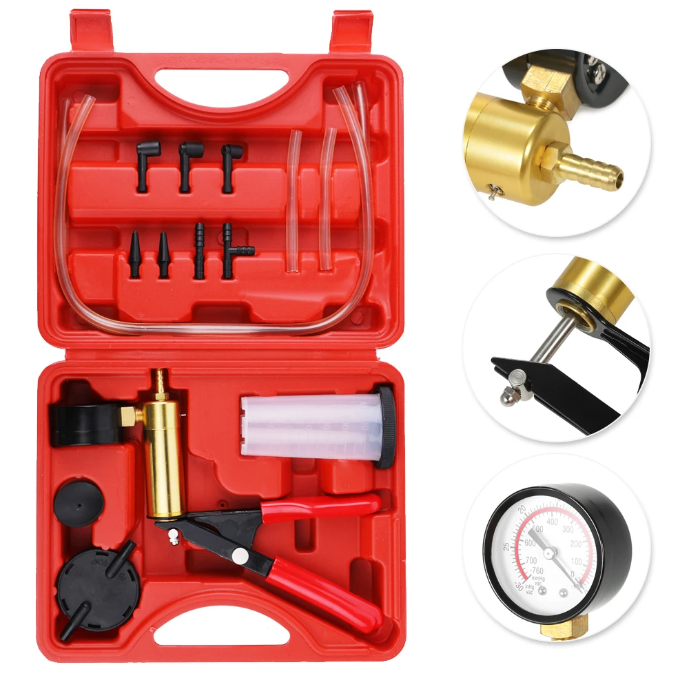 Этот профессиональный вакуумный насос используется для тестирования различных основных параметров и операций транспортного средства. Он может проверить вакуумные и напорные автомобильные компоненты. В комплект входит резервуар тормозной жидкости для кровотечения.