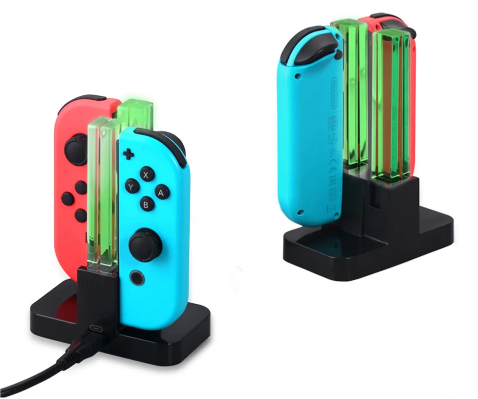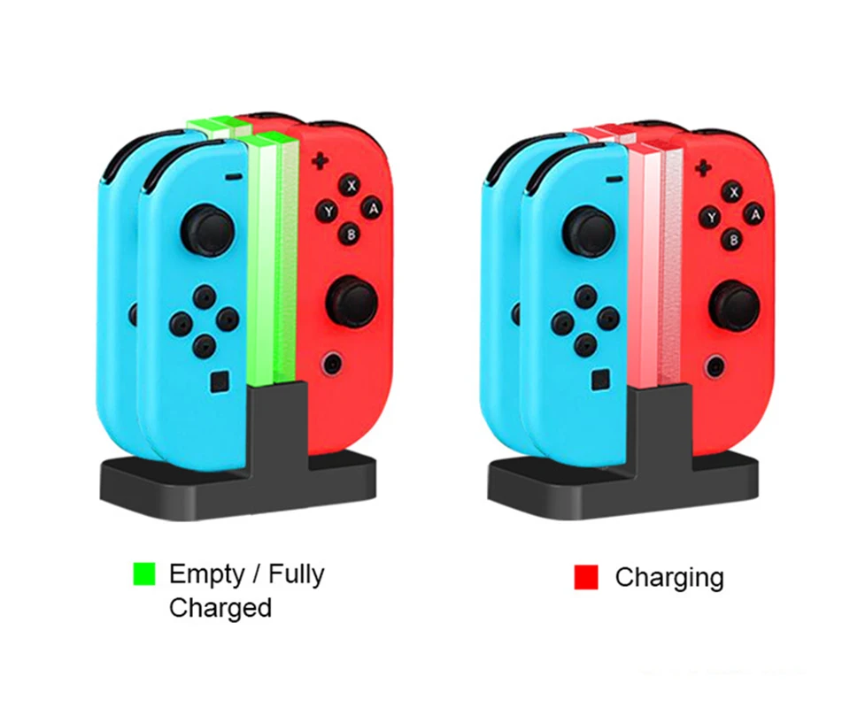 Это зарядное устройство Joy con для функций переключателя с интеллектуальным индивидуальным светодиодный-индикатором может указывать состояние зарядки для каждого Joy-Cons. Вы можете проверить состояние зарядки с первого взгляда, сразу узнать, какой контроллер joy con был полностью заряжен. Зарядка: красный; Зарядка: зеленый; Режим ожидания: зеленый
