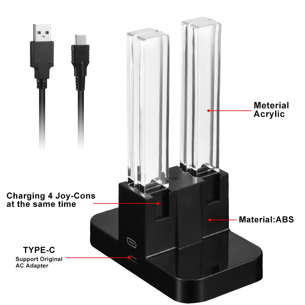 Эта зарядная док-станция Joycon специально разработана для зарядки контроллеров Switch Joy Con. Быстрая зарядка 4 джойстиков Joy-Con одновременно в 3,5 h. Если у вас есть несколько пар joy con, используйте зарядную станцию для одновременной зарядки четырех контроллеров, это лучший выбор для нескольких игр, таких как Mario Kart 8 Delux. Или удерживайте дополнительную пару для одного игрока, чтобы переключиться.