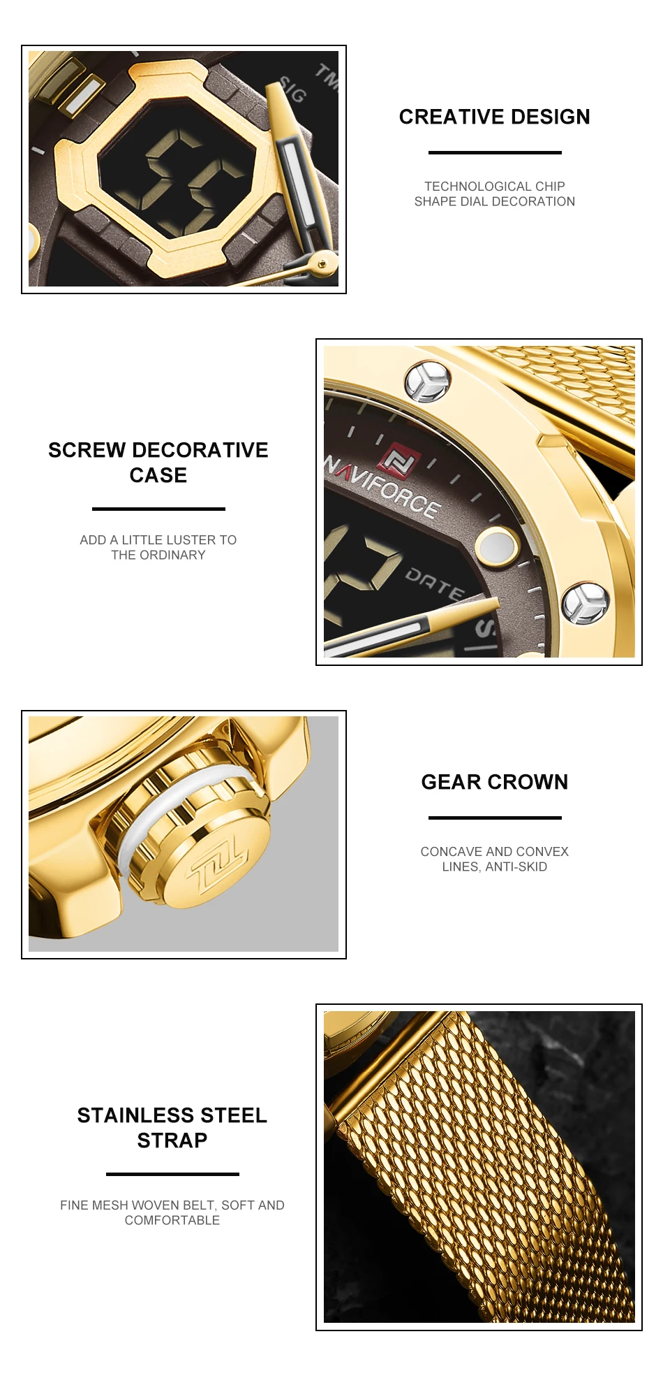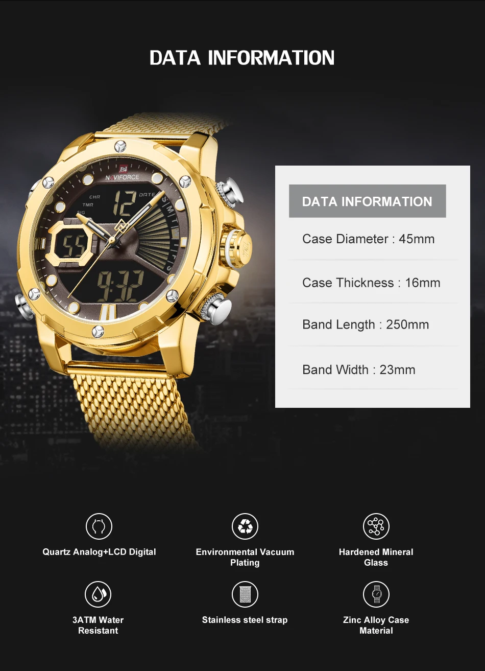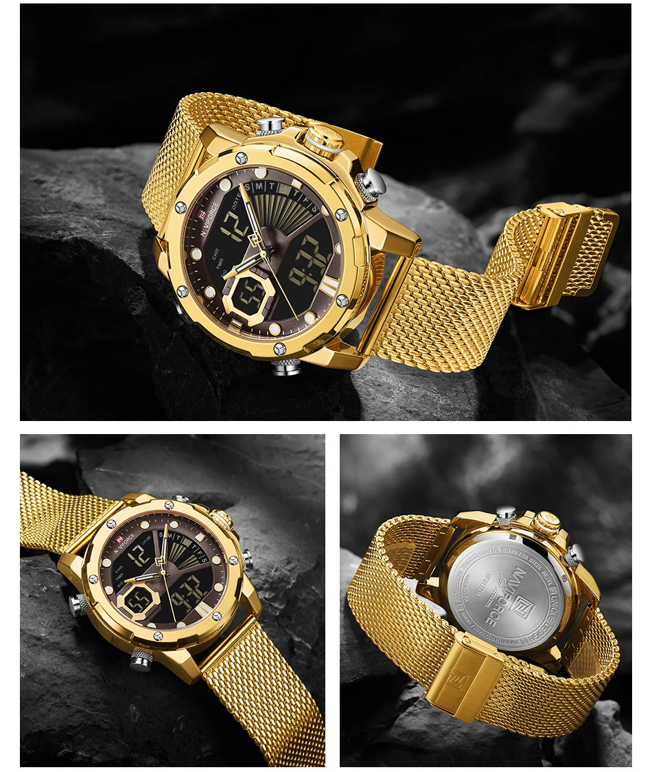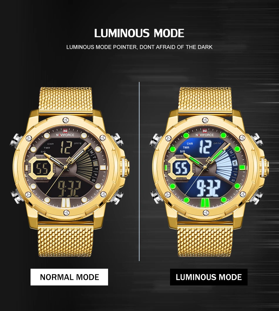 Описание 100% оригинал новый и высокое качество Будильник с 4 мин, Повтор Отображение дня, даты и времени Рождество каждый час Хронограф с круговым механизмом и 1/100 Двухъядерный Аналоговый и цифровой дисплей Функция EL (синий) Функция ежечасного звонка Браслет из нержавеющей стали Водонагреватель Технические характеристики Материал корпуса: сплав Чехол Диаметр: 45 мм Чехол Толщина: 16 мм Материал ремешка: сетчатый ремешок из нержавеющей стали Длина ремешка (включая чехол): 250 мм Ширина ремешка: 23 мм Вес изделия: 156 г Что входит в комплект 100% новый бренд NAVIFORCE 1 x аналоговый и цифровой дисплей с будильником и EL Blue Function Watch