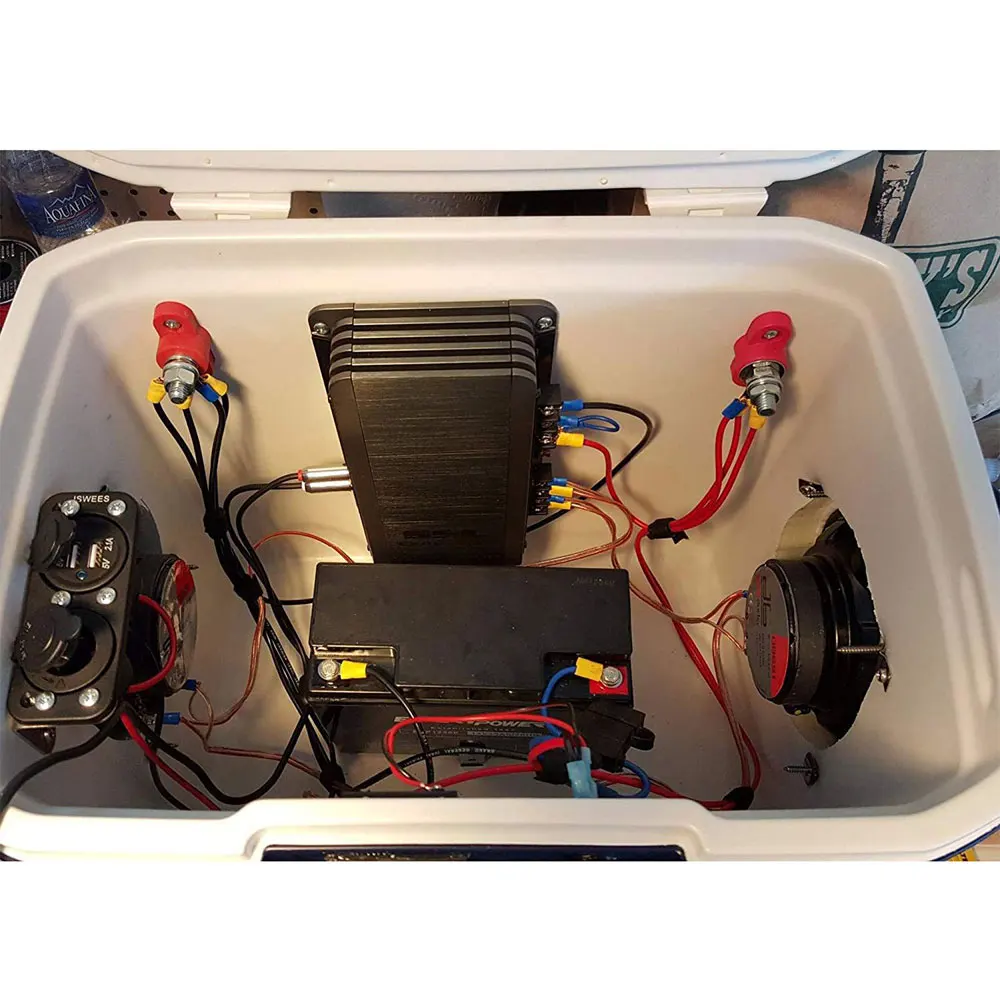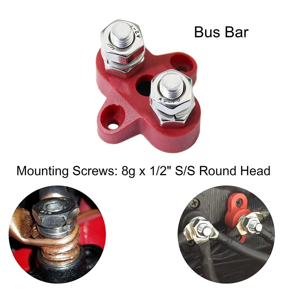 M8 (5/16 ") двойной сверхмощный терминал шпильки, шайба замка, гайка Нейлоновая конструкция с монтажными отверстиями Основание изготовлено из огнестойкого пластика для защиты вашей безопасности Подходит для грузовых автомобилей, внедорожников, автобусов, лодок и т. д. Особенности Возможность прерывания тяжелых кабелей для одного или нескольких соединений Красный и черный цвет позволяет легко и ясно кодировать цвет для проводки Армированное стекловолокном нейлоновое основание обеспечивает отличную механическую прочность и долговечность Сверхмощные клеммные шпильки (до M8)