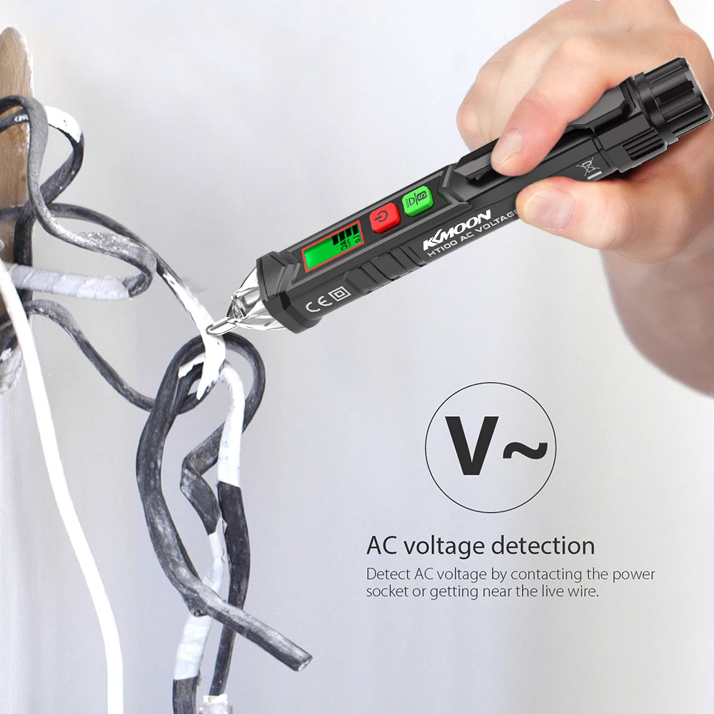 Detect AC voltage by contacting the power socket or getting near the live wire with non-contact tip.