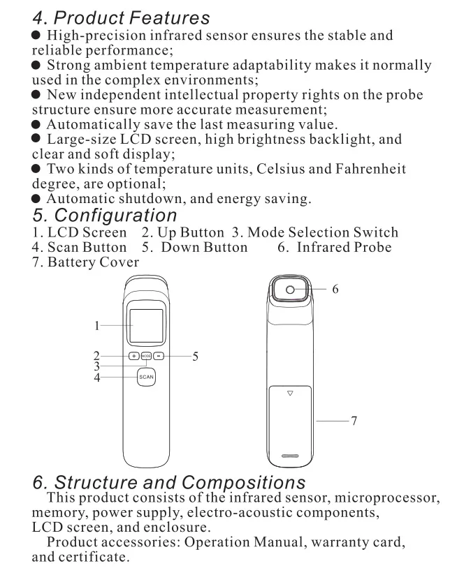 -Быстрая: время отклика составляет менее 1 сек -Простота в использовании: измерение одной кнопкой, простота в эксплуатации -Бесконтактный: Измерьте лоб человеческого тела и не прикасайтесь к коже человеческого тела -Длительный срок службы: 2 батарейки ААА (не входят в комплект) можно использовать более 100000 раз, а срок службы продукта более 3 миллионов раз. -Расстояние измерения: он может быть адаптирован в пределах 3 ~ 15 см без фиксированного расстояния измерения. -Большой экран: Большой ЖК-дисплей, белая подсветка, может быть четко отображена при любом освещении. -Температурная сигнализация: установите температуру тревоги свободно. -Данные хранения: 32 измерения хранятся для анализа, справки и сравнения. -Изменение настроек: параметры настройки могут быть изменены, чтобы адаптироваться к различным цветовым расам (белый, черный, желтый и т. д.) -Преобразование единиц: Используйте градусы Цельсия и Фаренгейта, чтобы конвертировать друг друга.