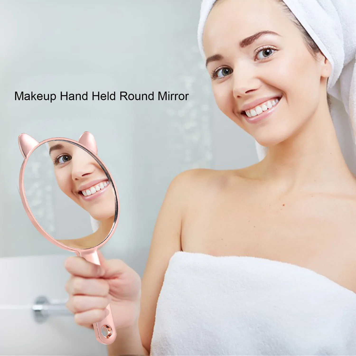 Закончено высококачественным блестящим покрытием из розового золота. Ручное зеркало закреплено в твердой оправе из толстого пластика.