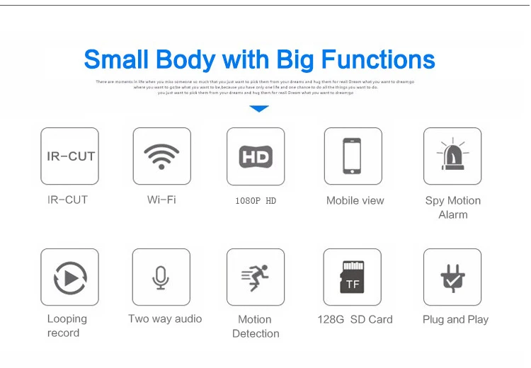 ● IR-CUT/Wi-Fi/1080P HD/Мобильный вид ● Шпионская Мотивационная сигнализация/Looping запись ● Двустороннее аудио/Обнаружение движения ● Sd-карта 128G/Plug and Play