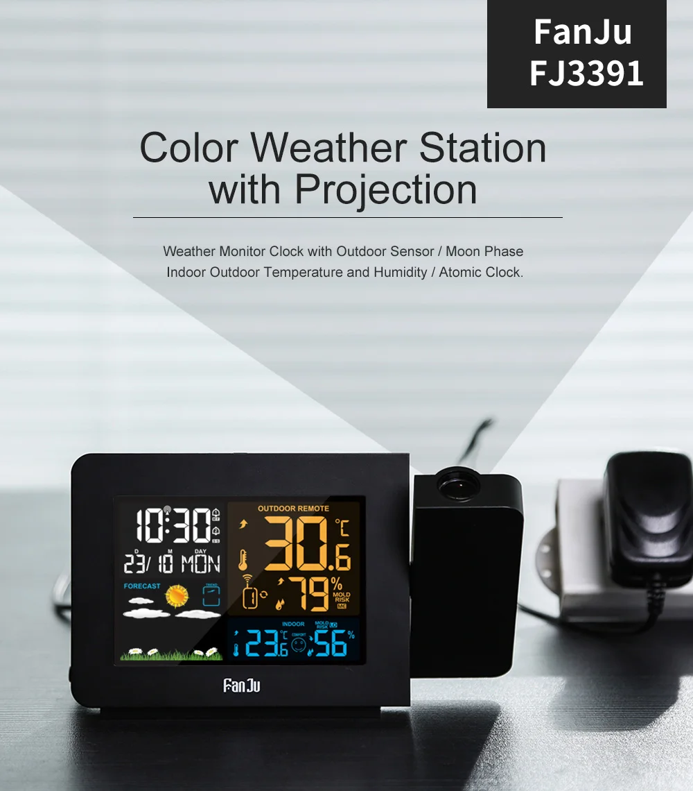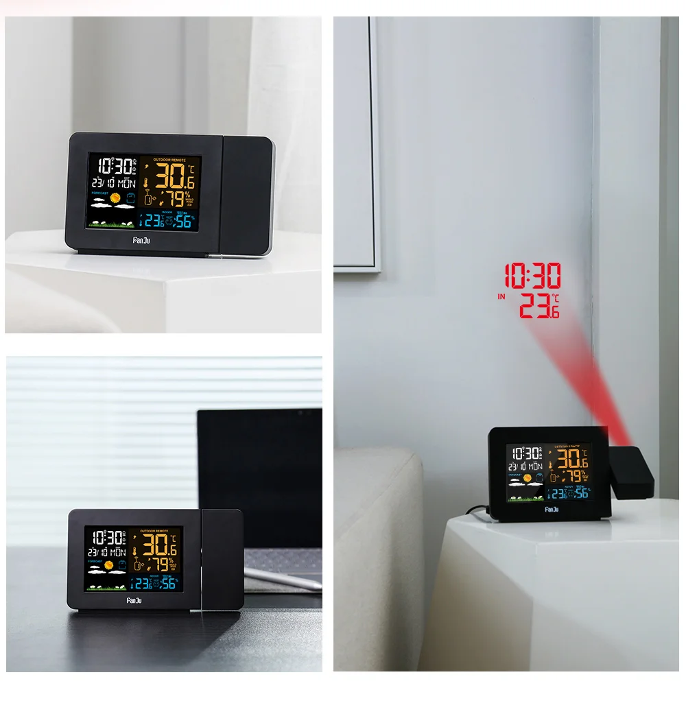 2019 многофункциональная метеостанция, цифровой проекционный будильник, новый дизайн, с использованием более четкого цветного экрана. Вы можете увидеть время, календарь, температуру и влажность в помещении и на улице, комфорт и прогноз погоды на будущее. В то же время он имеет проекцию, которую можно регулировать под разными углами. Время, наружные и внутренние температуры могут быть проецированы все время. Когда вы находитесь вдали от дома, вы можете отключить источник питания. В это время аккумулятор сохранит ваши записи до тех пор, пока будильник не будет восстановлен, когда вы вернетесь домой.