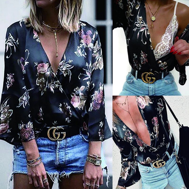 Модная женская блузка с цветочным принтом, рубашка на весну и осень, женские свободные рубашки с длинным рукавом и v-образным вырезом, сексуальные топы, женские блузы