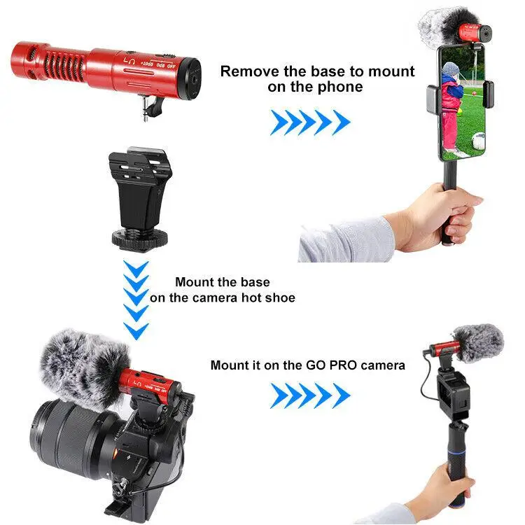 Камера: когда микрофон установлен на видеокамеру или зеркальную камеру, установите разъем для обуви в держатель обуви и поверните разъем для обуви, чтобы повернуть его по часовой стрелке, чтобы закрепить его.