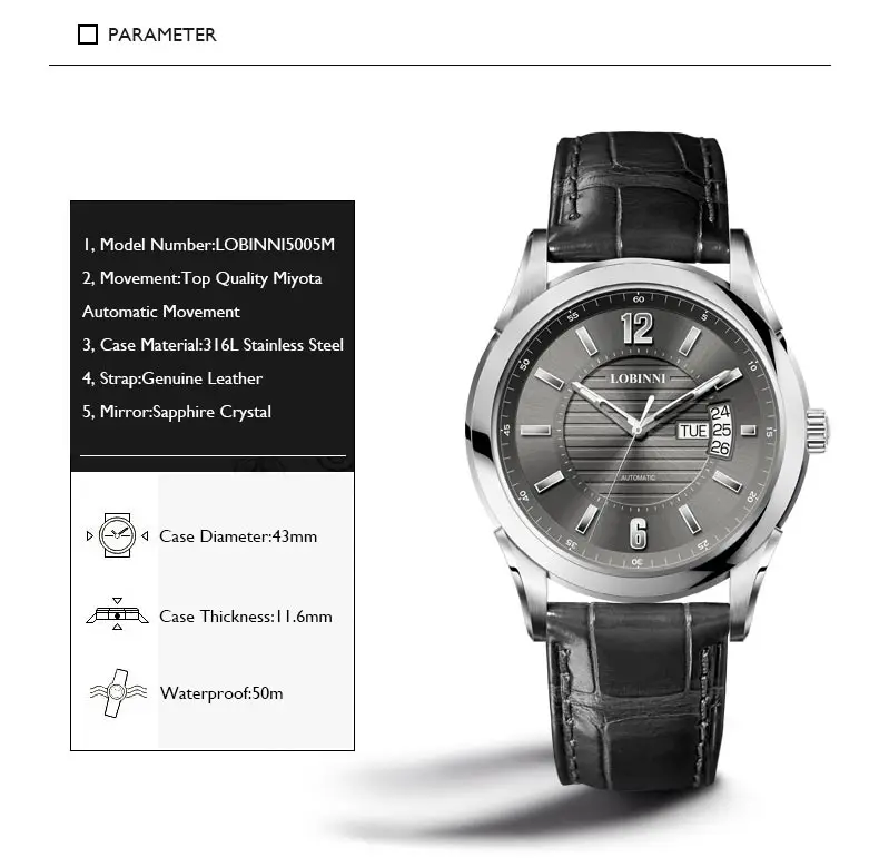 О мужские часы LOBINNI LOBINNI dress watches-это бренд, специализирующийся на бизнесе и моде, который начинается в 1985 году. Отдел дизайна имеет 30 профессиональных дизайнеров часов. Основные наручные часы с модными элементами платья, и все больше и больше людей любят качество и дизайн. Все больше и больше дизайнеров присоединяются к нам, и мы постоянно стремимся проектировать больше часов, которые отвечают различным стилям. 【Материал: 】мужские часы с 316L чехол из нержавеющей стали, Анти-Царапины сапфировое зеркало, нержавеющая сталь/ремешок из натуральной кожи 【 Функции: 】 мужские наручные часы с высоким качеством Japan Miyota автоматическое движение и точное время в пути. Автоматические часы для мужчин с классическим дизайном с двойным календарем, мужские часы с водонепроницаемостью 50 м, швейцарские мужские фирменные часы с модным и деловым стилем, вы будете более уверены, И нравится. 【Параметры и детали: 】 детали мужских часов paremeter: 1. Номер модели: LOBINNI-5005 2, высокое качество Япония Miyota автоматический механизм 3, материал корпуса: нержавеющая сталь 316L 4. Ремешок: ремешок из нержавеющей стали/ремешок из натуральной кожи 5. Зеркало: сапфировое зеркало с защитой от царапин 6, чехол Диаметр: 43 мм 7, чехол Толщина: 11,6 мм 8, ширина ремешка: 22 мм 9, водонепроницаемый: 50 м 10, прозрачная задняя крышка 11, функции: водонепроницаемый, двойной календарь 【 Подходящий Случай: эти мужские механические водонепроницаемые часы подходят для любых случаев, подходят не только для ношения на рабочем месте, но и для повседневной носки. На специальных фестивалях это также лучший подарок для любимых, друзей и влюбленных, таких как день рождения, Рождество, День Святого Валентина, День благодарения, Пасха, Черная пятница и т. д. 【 Качество и обслуживание: эти мужские часы эксклюзивные спроектированы, собраны, протестированы и доставлены, и каждый шаг очень строгий, гарантируя, что вы получите хорошие часы. Мы будем Гарантия 18 месяцев. И Ваше удовлетворение-наша гордость, мы ответим на ваш вопрос в течение 24 часов.