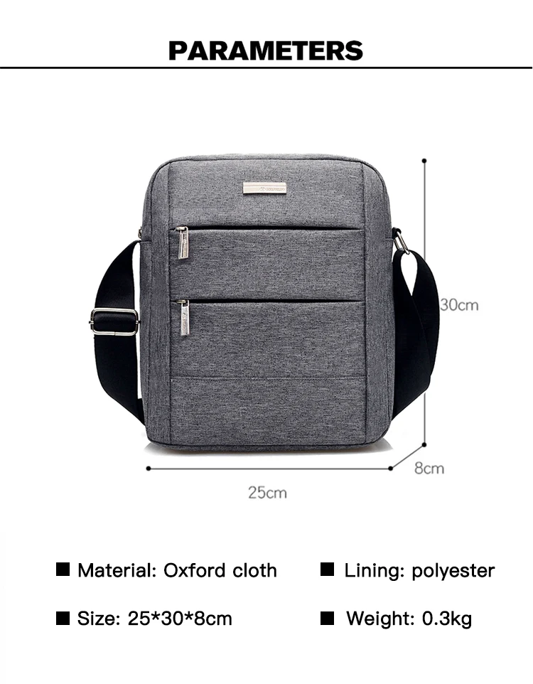 Товар: мужская сумка через плечо Материал: ткань «Оксфорд» Размеры: 25 см X 8 см X 30 см Вес: 0,3 кг Цвет: черный/серый Особенности: Портативный Стиль: Повседневное Костюм для: мужчин, мужчин Применение: открытый, офисный Тип сумки: мужская сумка Ключевые слова: модные мужские сумки, повседневная сумка-мессенджер, мужские сумки через плечо Примечание: 1. Из-за разницы между различными дисплеями изображение может не отражать фактический цвет изделия. 2. Возможно отклонение в 1-2 см из-за различных методов измерения, спасибо.