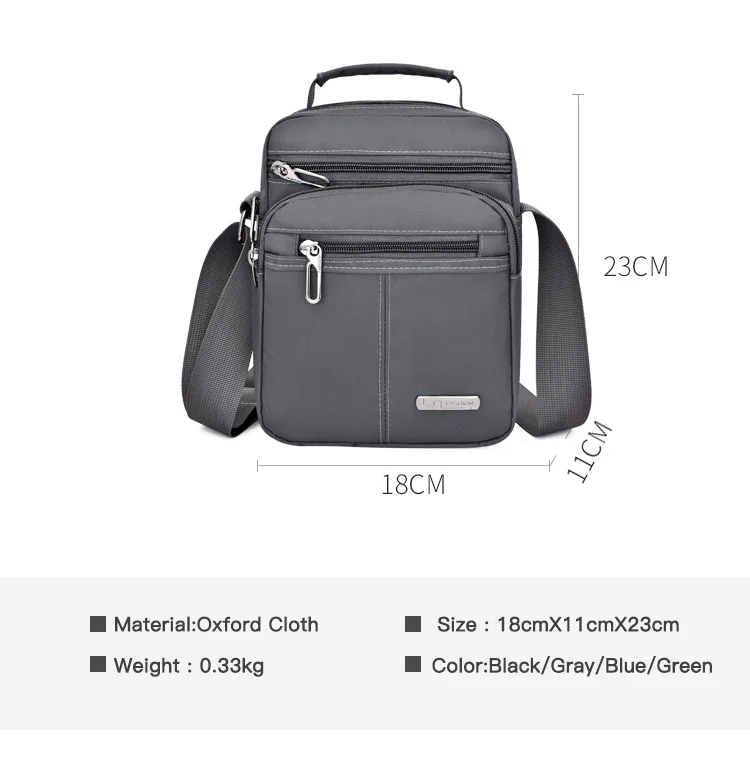 Product Item:Men Handbag Material:Oxford Cloth Size : 18cmX11cmX23cm Weight : 0.33kg Color:Black/Gray/Blue/Green Feature:Portable Style:Casual Suit for:Men,Male Occasion:Outdoor,Office Bag Type:Men Handbag Key Word:Fashion Men Handbags,Casual Messenger Bag,Man Shoulder Bags Note: 1.Due to the difference between the different displays, the image may not reflect the actual color of the item. 2.Please allow due to different measurement methods 1-2 cm deviation exists, thank you.