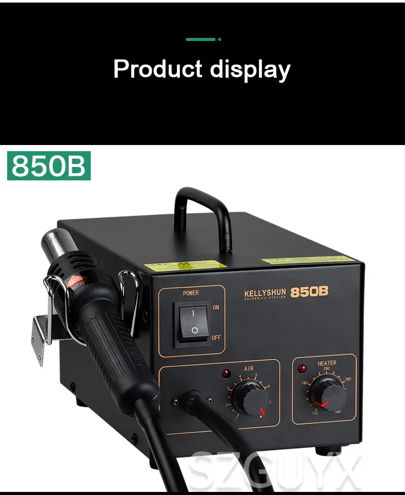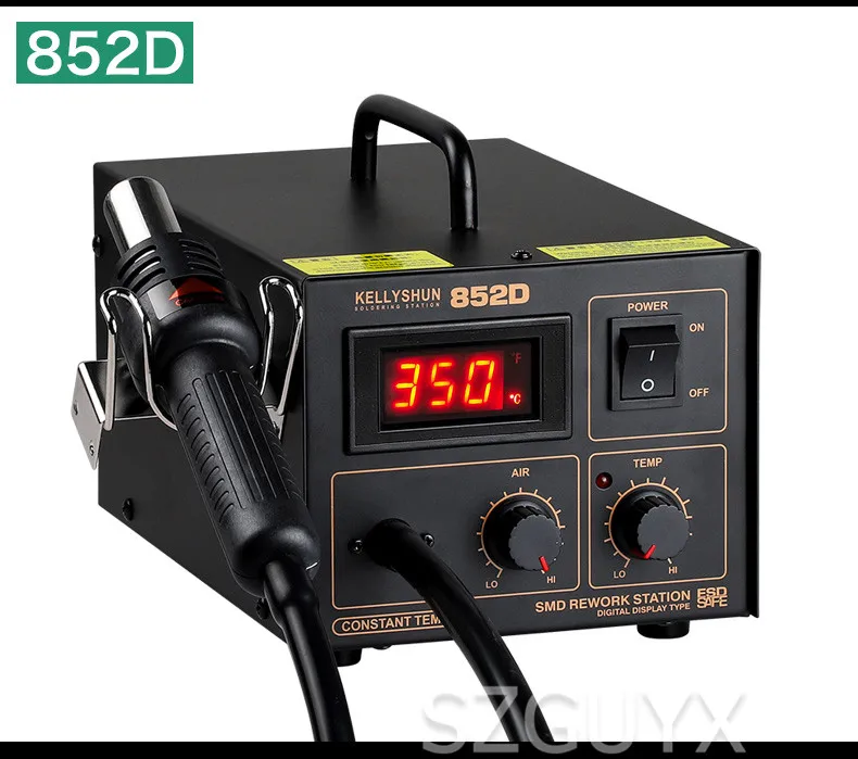 Название продукта: пистолет с постоянной температурой и горячим воздухом Модель: 850B Метод регулировки температуры: Тип ручки Диапазон температур: 100-480 °C Рабочее напряжение: AV220V / 50 Гц Тип подачи воздуха: мембранный воздушный насос Отток: 23 л/мин (макс.) Шестерня воздушного объема: шестерня 1-8 Уровень шума: <52 дБ Потребляемая мощность: 550 Вт Вес продукта: около 3,2 кг Модель продукта: 852D Метод регулировки температуры: цифровой дисплей Диапазон температур: 100-480 °C Рабочее напряжение: AV220V / 50 Гц Тип подачи воздуха: мембранный воздушный насос Отток: 23 л/мин (макс.) Передача объема воздуха: A25-A99 Уровень шума: <52 дБ Потребляемая мощность: 550 Вт Вес продукта: около 3,2 кг
