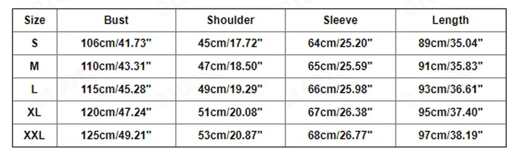 Размеры Обхват груди Сумка на плечо Рукава Длина S 106 см/41,73'' 45 см/17,72'' Высота голенища 64 см; 25,20'' 87 см/34,25'' М 110 см/43,31'' 47 см/18,50'' 65 см/25,59'' 89 см/35,04'' L 115 см/45,28'' 49 см/19,29'' 66 см/25,98'' 91 см/35,83'' XL 120 см/47,24'' 51 см/20,08'' 67 см/26,38'' 93 см/36,61'' XXL 125 см/49,21'' 53 см/20,87'' 68 см/26,77'' 95 см/37,40''