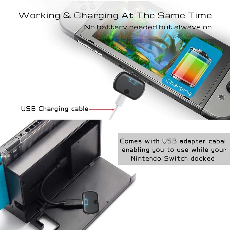 Plug & Play, драйвер не нужен: аккумулятор не нужен! Встроенная технология smart USB PD сквозной зарядки. Непрерывная Беспроводная потоковая передача звука даже при проходной зарядке для переключения и без перегрева. Всегда включается при подключении к порту usb type-C напрямую или подключается к порту USB A для домашнего режима через кабель-адаптер. Используйте автономный драйвер переключателя и не требуется дополнительный драйвер