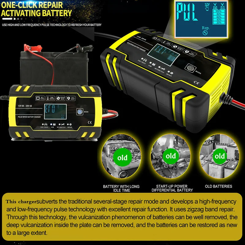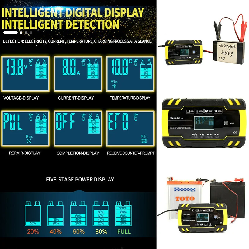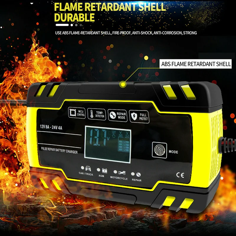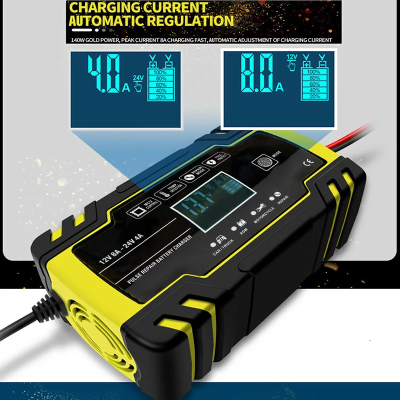 ЭтоУмное 6-150AH 12V 24V 4A 8A свинцово-Кислотное зарядное устройствоИдеальный аксессуар для зарядки свинцово-кислотных аккумуляторов вашего автомобиля, включая кальций, гель, AGM,EFB, SLA, Влажные батареи безопасным и простым способом. Это зарядное устройство использует 3 этапа зарядки системыПостоянный ток, Постоянное напряжение, ЗатемЗарядное устройство. Постоянный ток с меньшим количеством тепла защищает батарею и остается в безопасности при оставлении ее для зарядки. Интегрированный Датчик позволяет полностью видеть, сколько энергии используется, и специальная функция защиты безопасности обеспечивает ваше спокойствие.