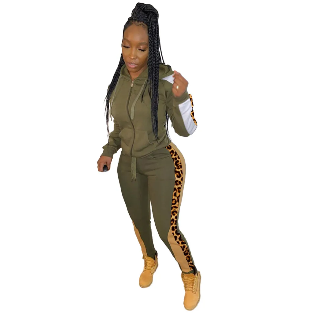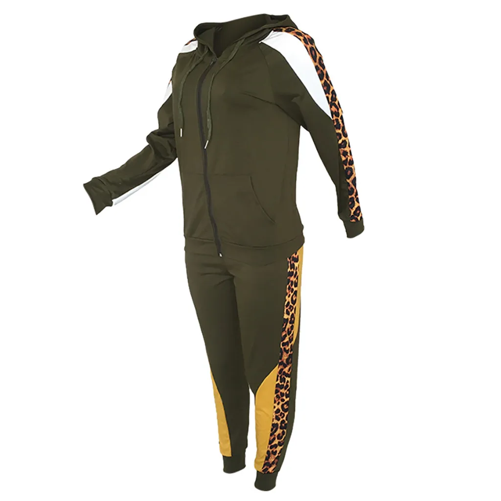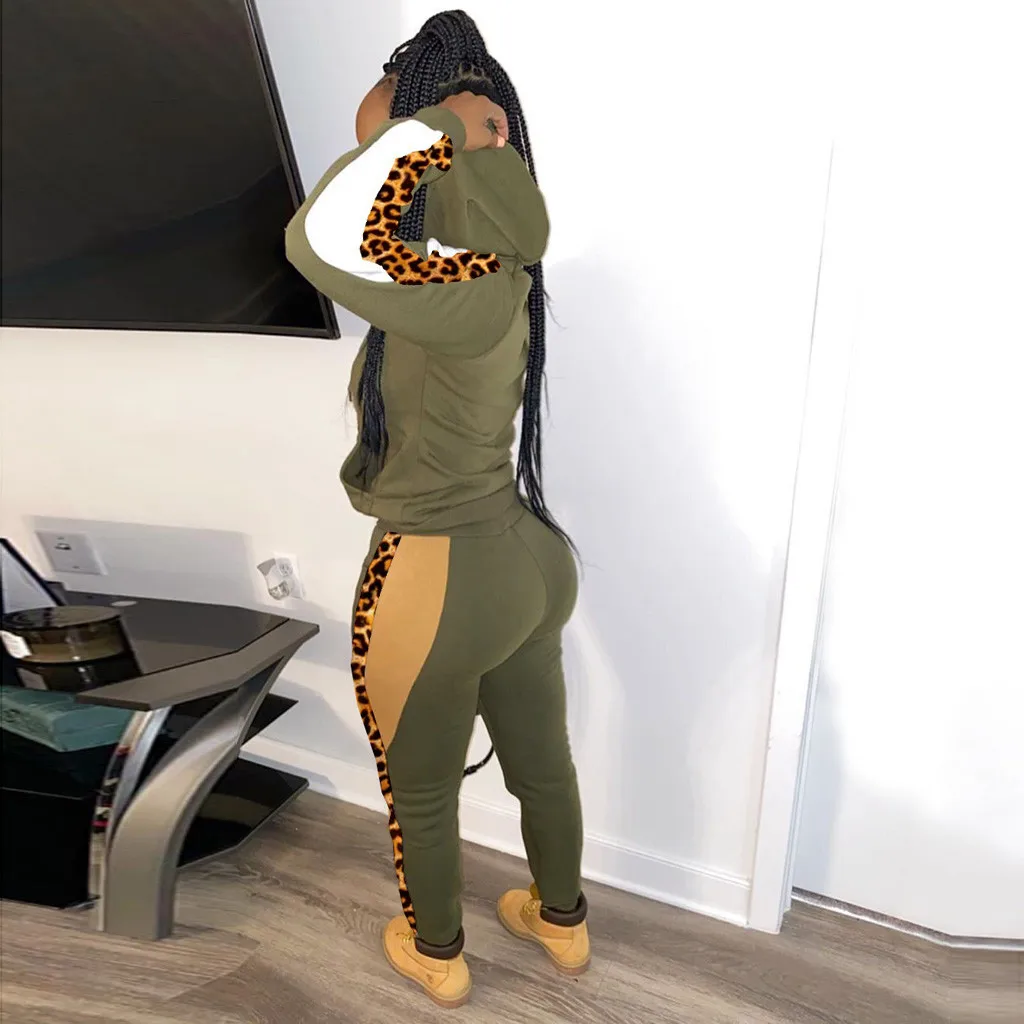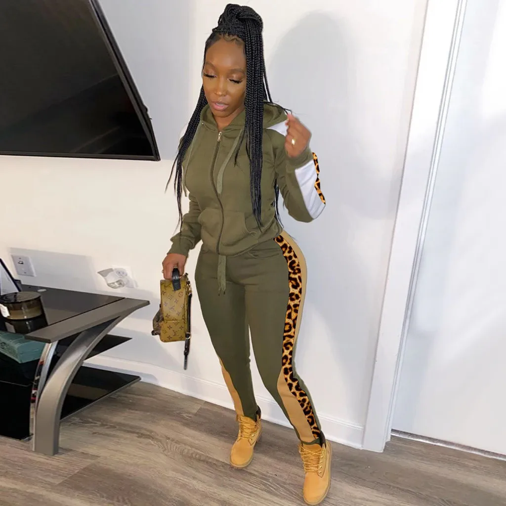 Модный женский леопардовый принт с длинным рукавом и брюки повседневный комплект с капюшоном на молнии