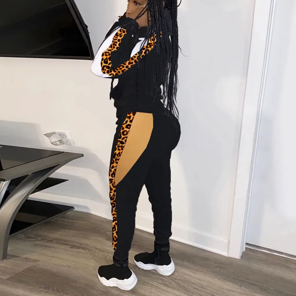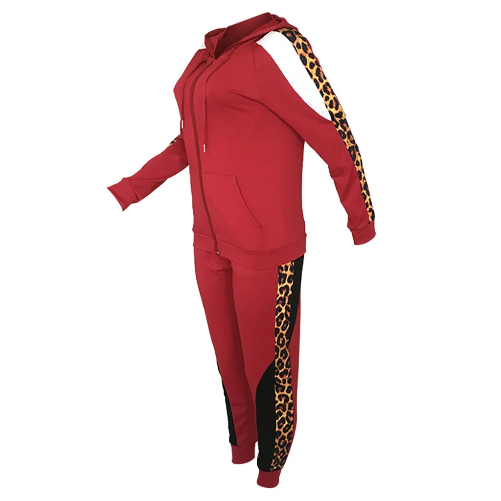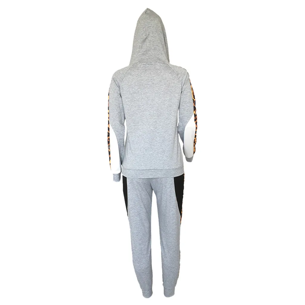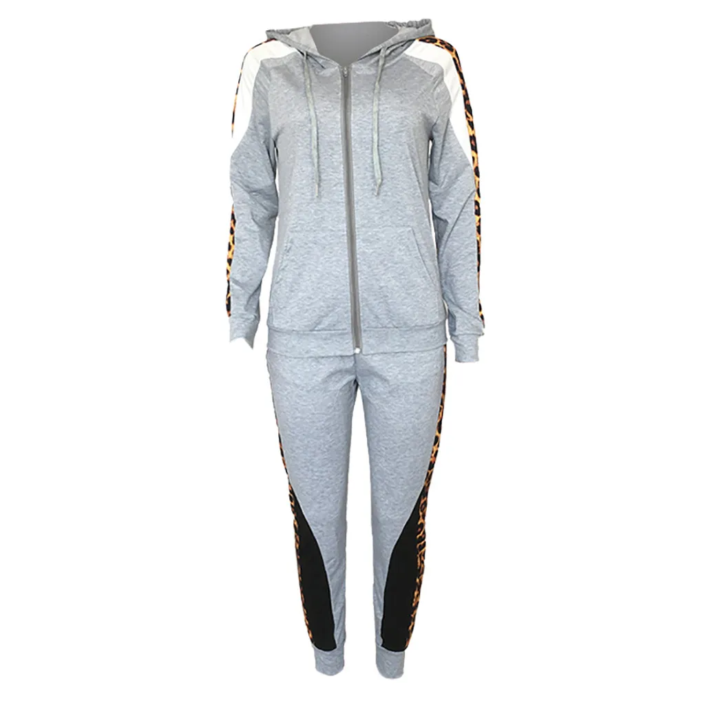 Модный женский леопардовый принт с длинным рукавом и брюки повседневный комплект с капюшоном на молнии
