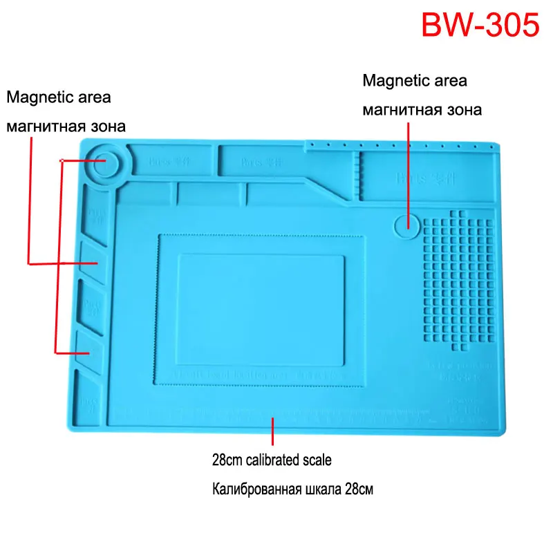 1. Этот силиконовый коврик может выдерживать высокие температуры до 500 градусов, после использования он может защитить станцию обслуживания от повреждения при высоких температурах. 2. Рабочая панель имеет позиционирование винтов и аксессуаров, магнитные области на каждом силиконовом коврике доступны, что облегчает размещение аксессуаров при разборке телефона. 3. Агрегация тепла: на коврике накопление тепла, удар сварки ЦП также очень удобно 4. Не бойтесь клея, такого как AB Клей, мгновенный клей и т. д., если падение на силиконовый коврик, после того, как клей высохнет, его легко оторвать.