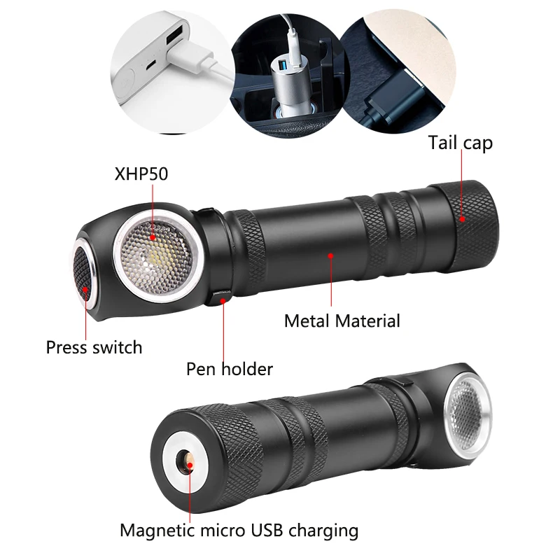 Фонарик + Магнитный USB-кабель + резиновое кольцо + зажим для ручки + кронштейн для фар + ремень для фар