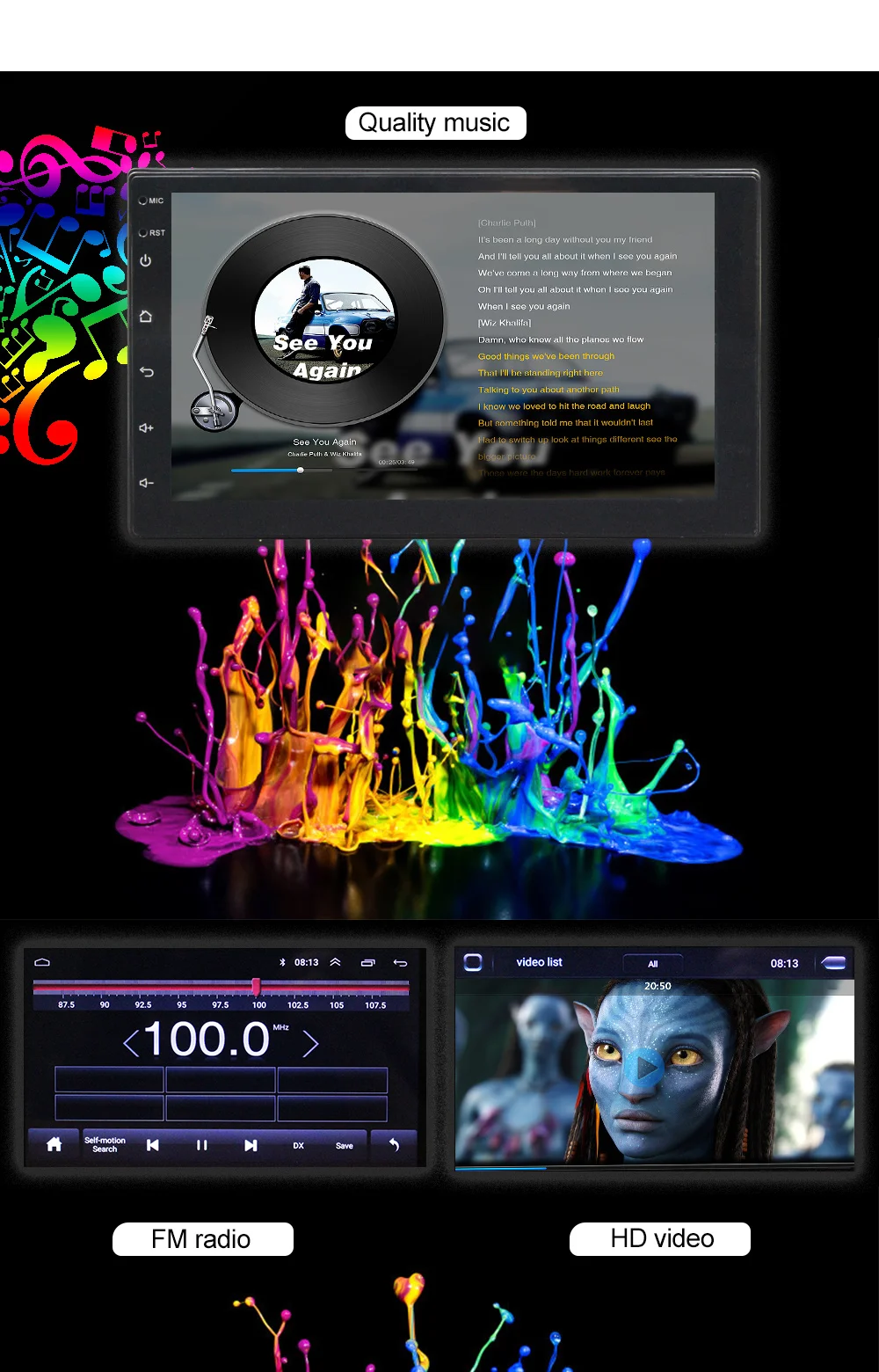 Параметр: ОС: Android 8,1 GO Оперативная память: 1 ГБ DDR3 Разрешение: 1024*600. Емкостный сенсорный экран Поддержка: Navitel для российских клиентов Процессор: четырехъядерный A7/1,3 GHz x 4 Звуковой процессор: TDA7388 Поддержка настроек логотипа 2 din Android 8,1 go мультимедийный плеер для универсальных большинства старых автомобилей Основные характеристики: Емкостный сенсорный экран 7 дюймов HD сенсорный экран (1024x600): Поддержка 5-точечного высокой четкости Мульти-сенсорный экран, это более удобно для вас, чтобы использовать -Операционная система Android 8,1: совместима с подавляющим большинством приложений Android, вы можете установить свои любимые приложения и насладиться новейшими технологиями -Встроенный Bluetooth (4,0): Встроенный микрофон и внешний разъем для микрофона, поддержка телефонной книги и функций Bluetooth, когда у вас есть входящий вызов, музыка автоматически прекратится, чтобы вы могли бесплатно позвонить -Встроенный WiFi: Поддержка стандарта 802.11b / g / n WLAN, высокая производительность, низкое энергопотребление -Встроенный GPS: Внутренняя поддержка и Внешняя GPS карта, вы можете скачать GPS приложение онлайн или получить карту онлайн-поставщиков карт для использования спутниковой навигации, и карта может быть запущена в фоновом режиме, И поддерживает Голосовое управление -Поддержка медиаплеера Android: можно воспроизводить музыку, фильмы, местные CD фотографии или USB -Поддержка поиска последней книги телефон: вы можете скачать телефонную книгу для поиска и поиска контактов, просто введите первую букву имени и вы найдете некоторые соответствующие имена, затем вы можете выбрать правильное имя -Hd-камера: с hd-камерой, стабильным дисплеем и четкими изображениями, с широкоугольным обзором 120-140 градусов -Многоформатное декодирование аудио и видео: поддержка полноформатного 1080P, воспроизведение видео до 4K -Многоязычный: английский/русский/французский/немецкий/испанский/итальянский/португальский и т. Д.