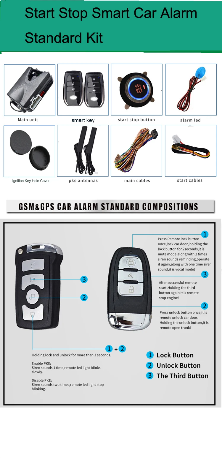 Детали автомобильной сигнализации-- Основные функции1.Бесключевая система входа2. Двигатель Пусковой остановки3. Двигатель с дистанционным запуском4. Боковая дверная сигнализация5. Дистанционное открытие багажника6. Удаленный поиск автомобиля7. Пусковая сигнализация8. Умный анти-угон9. Режим отключения звука10. Автоматический Центральный замок (не отключить)11. Светильник вспышки открытой двери (не отключен)Рекомендуется карточка