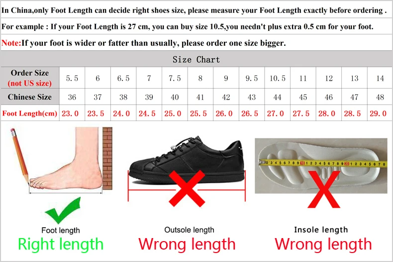 1. Мы не американские размеры, мы китайские размеры, в Китае только длина стопы определяет правильный размер. Пожалуйста, измерьте длину вашей стопы, а затем выберите размер в соответствии с нашей таблицей размеров. 2. Если вы чувствуете неприятный запах, это нормально, потому что новая обувь может иметь запах клея. 3. Фотография может отличаться от реальной обуви, фотография может быть яркой, настоящая обувь может быть темной. 4. Мы упаковываем обувь в пенопластовую сумку, а не коробку, поэтому обувь может немного помяться после получения.