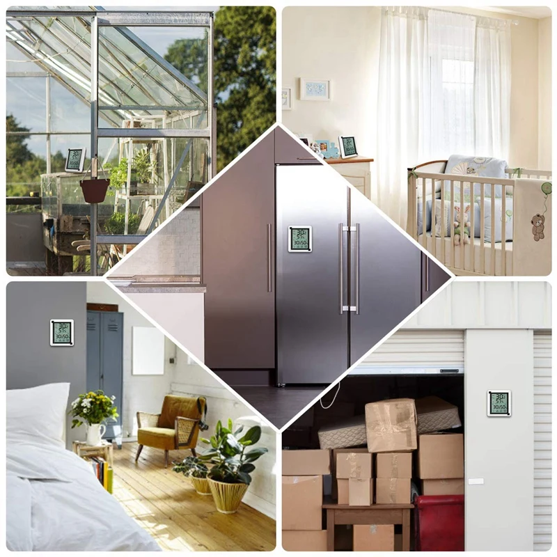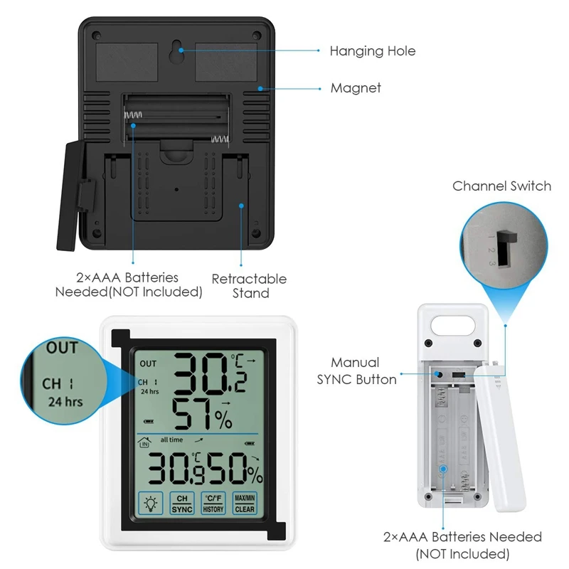 Подключение до 3 наружных блоков (посылка с одним наружным блоком). два высоких магнитных магнита на задней стороне основного блока, которые можно прикрепить к металлическим предметам. задняя часть основного блока имеет кронштейн, который может стоять в горизонтальном положении. высокая чувствительность кнопки управления для удобства эксплуатации. индикация комфорта, индикация тренда температуры и влажности.