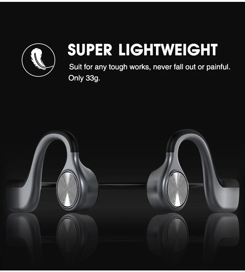 Номер модели: E9 Стиль: гарнитура с костной проводимостью Версия Bluetooth: BT5.0 Функция: легкий только 30g/ IPX5 Водонепроницаемый/cvc6.0 шумоподавление/CD узор Емкость аккумулятора: 200 мАч, поддержка до 6 часов игры Время воспроизведения: около 6-8 часов Время работы в режиме ожидания: 240 часов Порт зарядки: USB Размер: 135*93*48 мм Материал: АБС + пластик