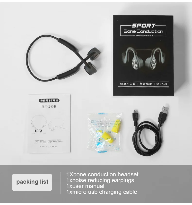 1X костной проводимости гарнитура 1X с функцией снижения уровня шума затычки для ушей 1X Руководство пользователя 1X micro usb кабель для зарядки