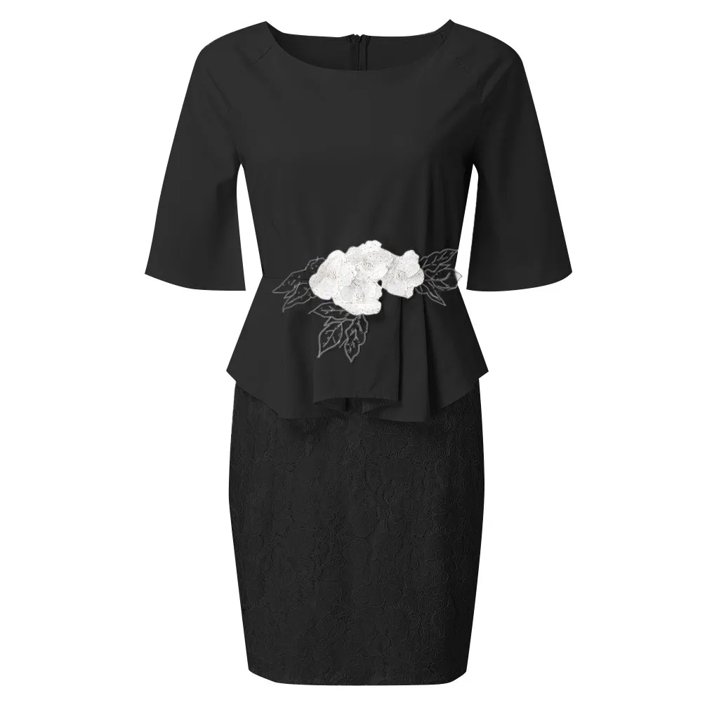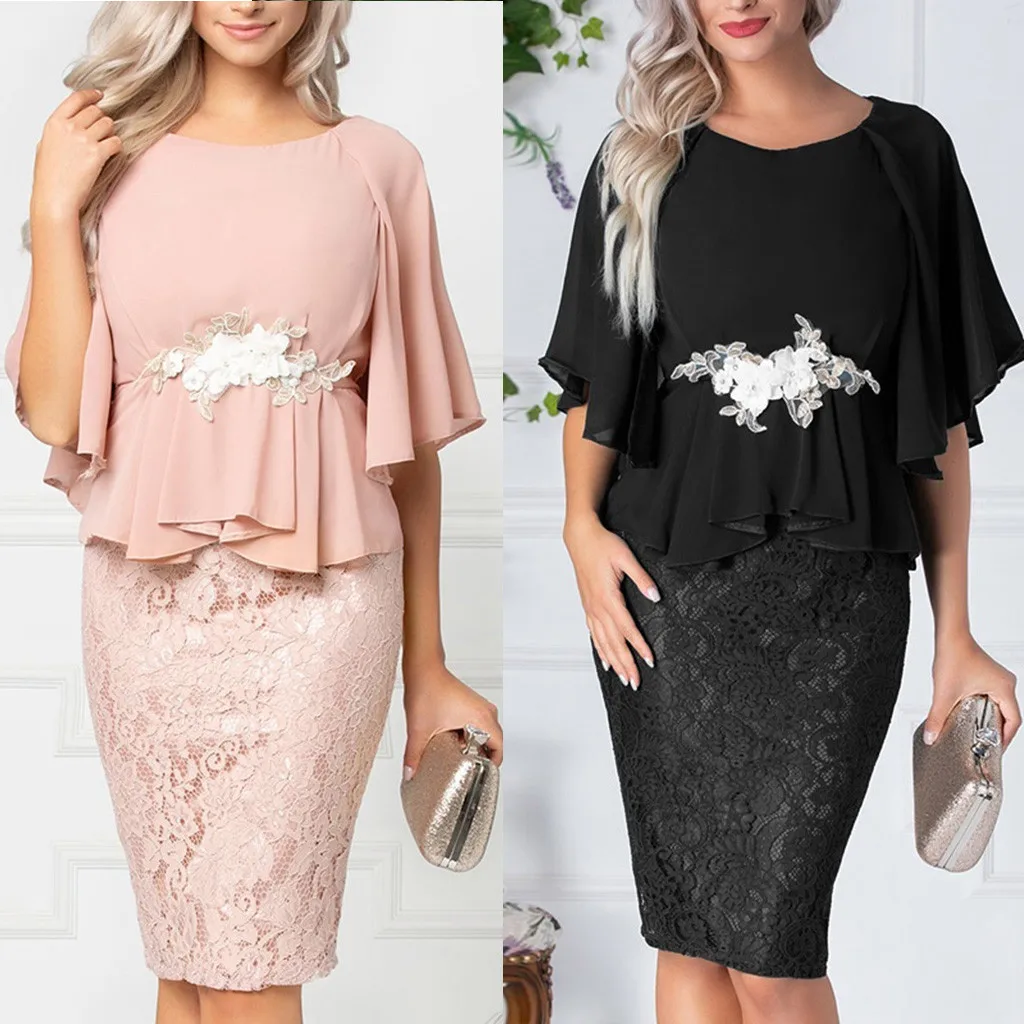 Женское шифоновое платье-футляр с рукавами-колокольчиками, кружевное лоскутное платье с баской, привлекательное облегающее платье с аппликацией на талии, 2020