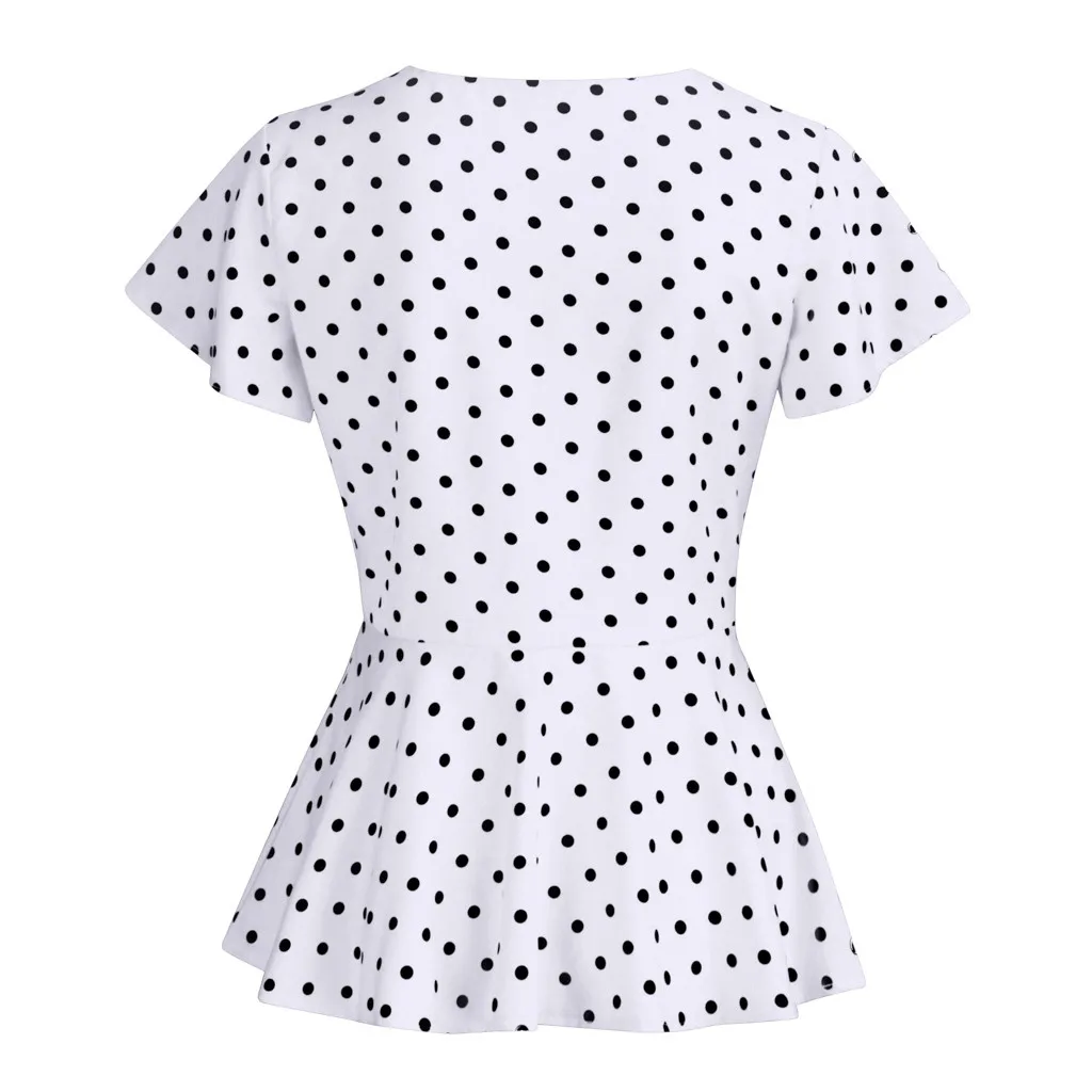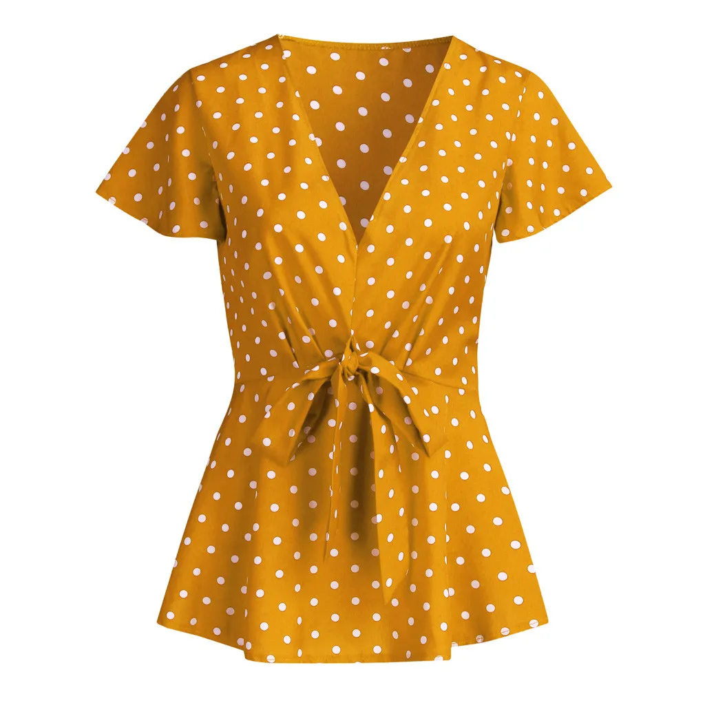 Женская рубашка размера плюс с v-образным вырезом и коротким рукавом, Топ в горошек с узлом спереди