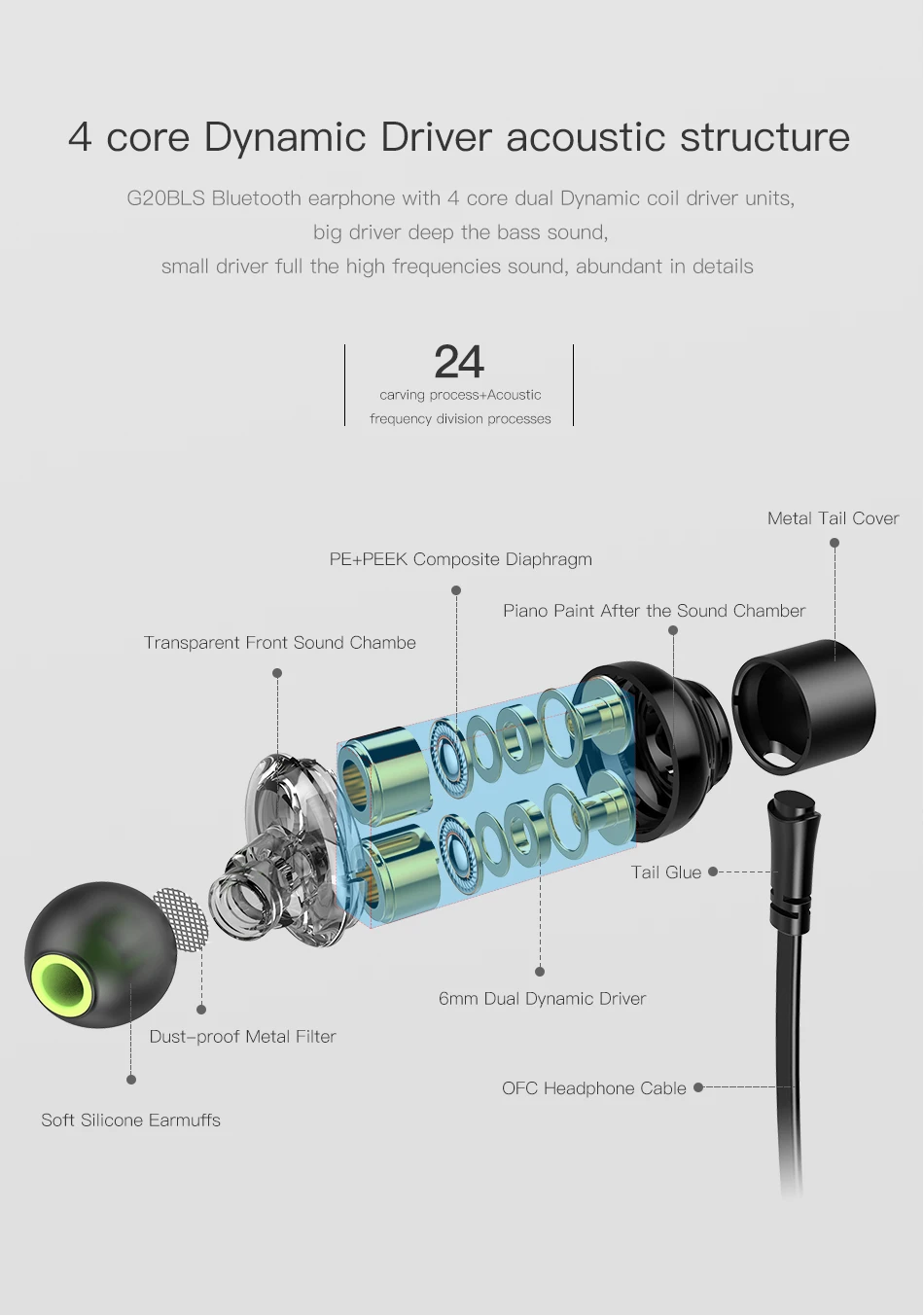 Акустическая структура динамического драйвера 4 ядра, bluetooth-наушники G20BLS с 4 ядрами, двухъядерным динамическим драйвером, большой драйвер, глубокий басовый звук, маленький драйвер, полный звук высоких частот, множество деталей