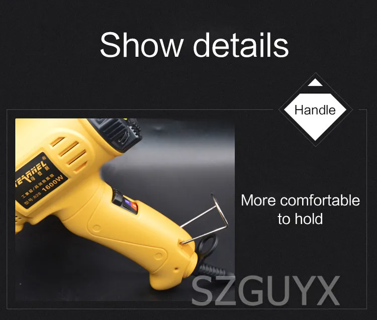 Мощность продукта: 1600 Вт Диапазон температур: 60-650 ℃ Размер корпуса: 245*200*72 мм Диаметр выхода воздуха: 35,5 мм Метод регулировки температуры: двухступенчатое плавное регулирование температуры Номинальная частота: 50 Гц