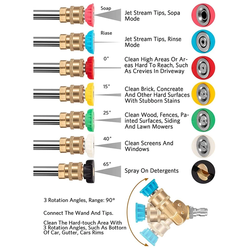 Различные наконечники сопла: в том числе 1 шт. наконечник сопла из красной нержавеющей стали 0 градусов, 1 шт. 15 градусов желтый, 1 шт. 25 градусов Зеленый, 1 шт. 40 градусов белый, 1 шт. 65 градусов черный, 1 шт. мыльный режим оранжевый наконечник сопла и синий наконечник сопла в краску для большинства ведущих брендов чистящих стержней высокого давления до 4500 PSI.