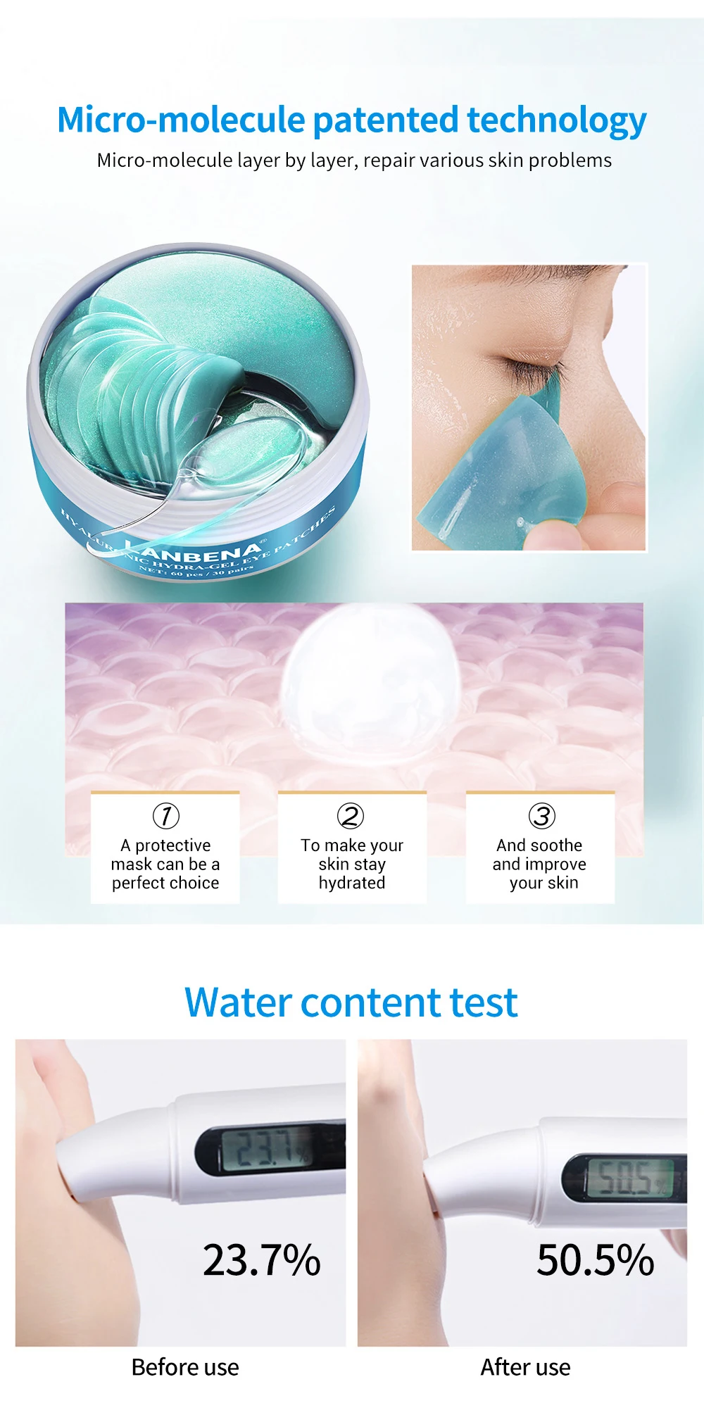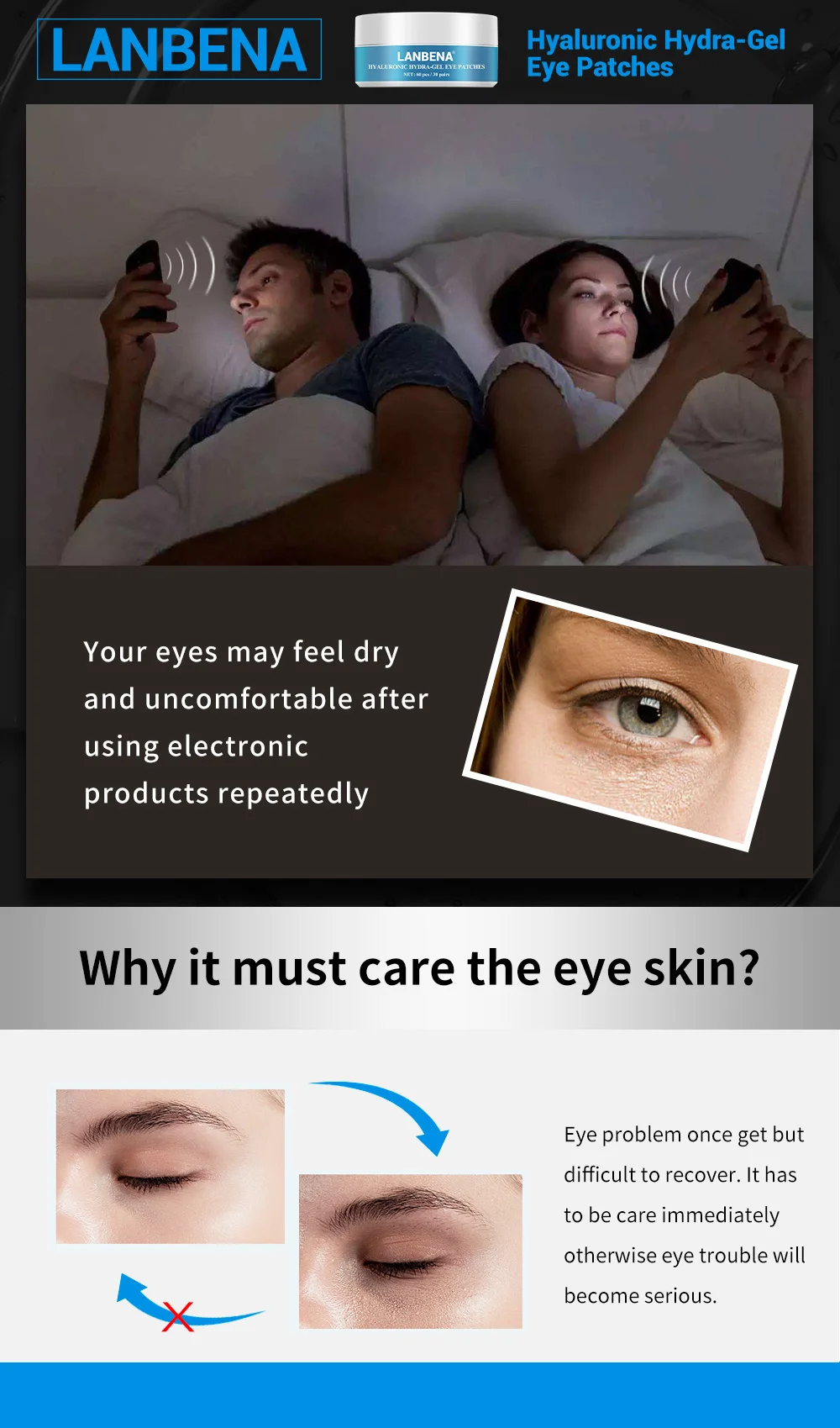 LANBENA гиалуроновая Гидра-гель патчи для глаз Ваши глаза могут чувствовать себя сухими и неудобными после многократного использования электронных продуктов Почему он должен заботиться о коже глаз? Проблема с глазами как только становится, но трудно восстановить. Необходимо немедленно позаботиться об этом, иначе проблемы с глазами станут серьезными.