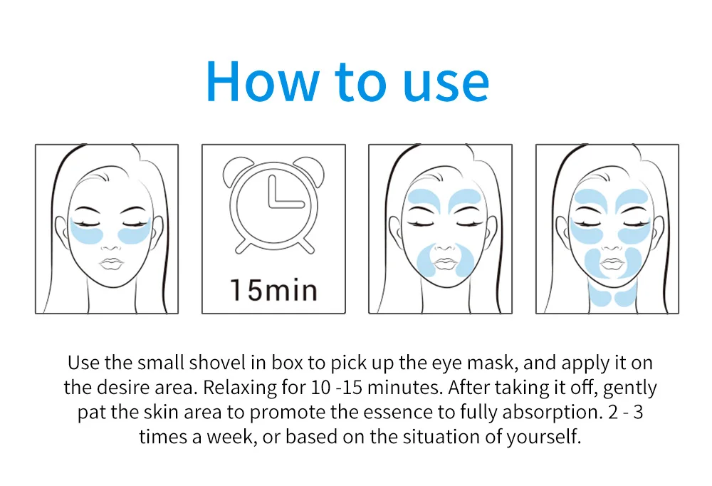 Как использовать Используйте маленькую лопату в коробке, чтобы подобрать маску для глаз и нанести ее на область желаний. Расслабление в течение 10 -15 минут. После снятия, мягко погладьте область кожи, чтобы повысить эссенцию для полного поглощения. 2 - 3 раза в неделю или в зависимости от ситуации.
