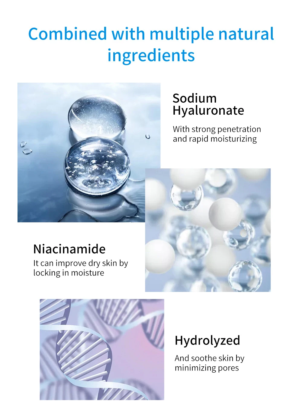В сочетании с несколькими натуральными ингредиентами Гиалуронат натрия С сильным проникновением и быстрым увлажнением Ниацинамид Он может улучшить сухую кожу, блокируя влагу Гидролизованный коллаген И успокаивает кожу, уменьшая поры