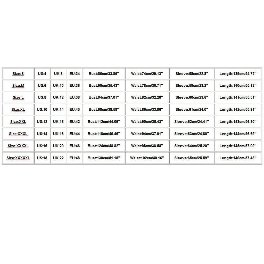 Размеры США Великобритания ЕС Бюст Талия Рукав Длина S 4. 8 34 86 см/33,86'' 74 см/29,13'' 58 см/22,8" 139 см/54,72'' М 6 10 36 90 см/35,43'' 78 см/30,71'' 59 см/23,2" 140 см/55,12'' L 8 12 38 94 см/37,01'' 82 см/32,28'' 60 см/23,6" 141 см/55,51'' XL 10 14 40 98 см/38,58'' 86 см/33,86'' 61 см/24,0" 142 см/55,91'' XXL 12 16 42 112 см/44,09'' 90 см/35,43'' 62 см/24,41'' 143 см/56,30'' XХХL 14 18 44 118 см/46,46'' 94 см/37,01'' 63 см/24,80'' 144 см/56,69'' XXXXL 16 20 46 124 см/48,82'' 98 см/38,58'' 64 см/25,20'' 145 см/57,09'' XXXXXL 18 22 48 130 см/51,18'' 102 см/40,16'' 65 см/25,59'' 146 см/57,48''