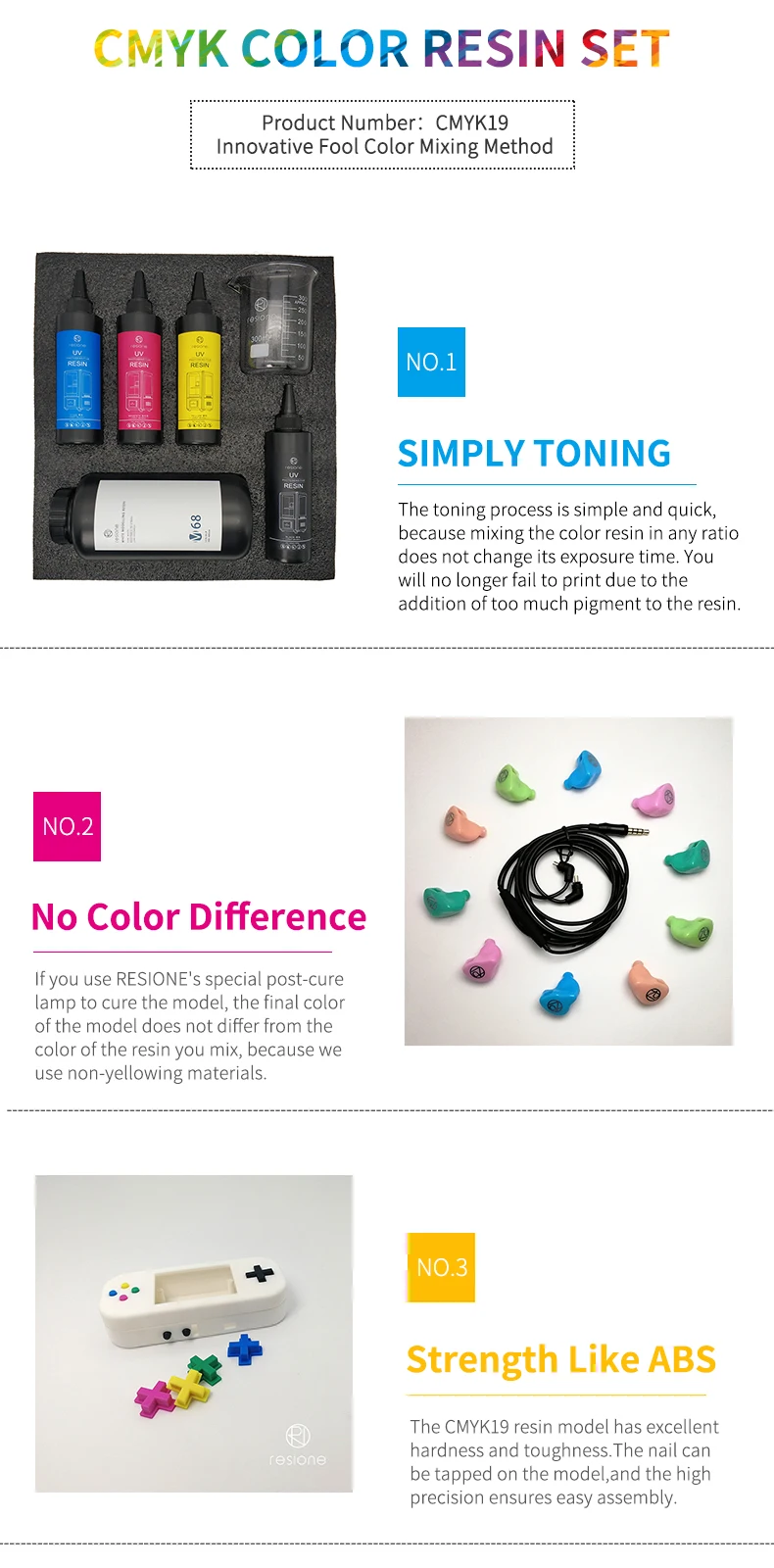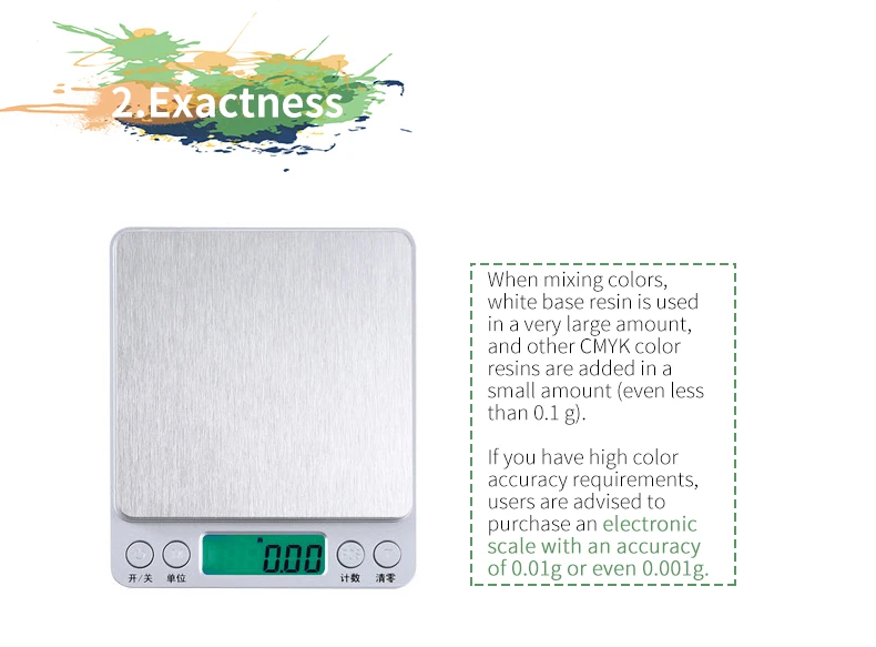 Этот продукт содержит 200 г каждый из C / M / Y / K и 1 кг чистой белой базовой смолы. Все окрашивающие основы-отверждаемая смола. Окрашивание традиционными цветными пастами приведет к разному времени воздействия смол из-за различного количества добавленных цветных паст. Чрезмерное добавление цветных паст может даже привести к тому, что смола не вылечится. Dibek19 может использовать только непрозрачные однотонные цвета. Если пользователям нужно смешивать полупрозрачные цвета, рекомендуется использовать с прозрачной смолой G217.