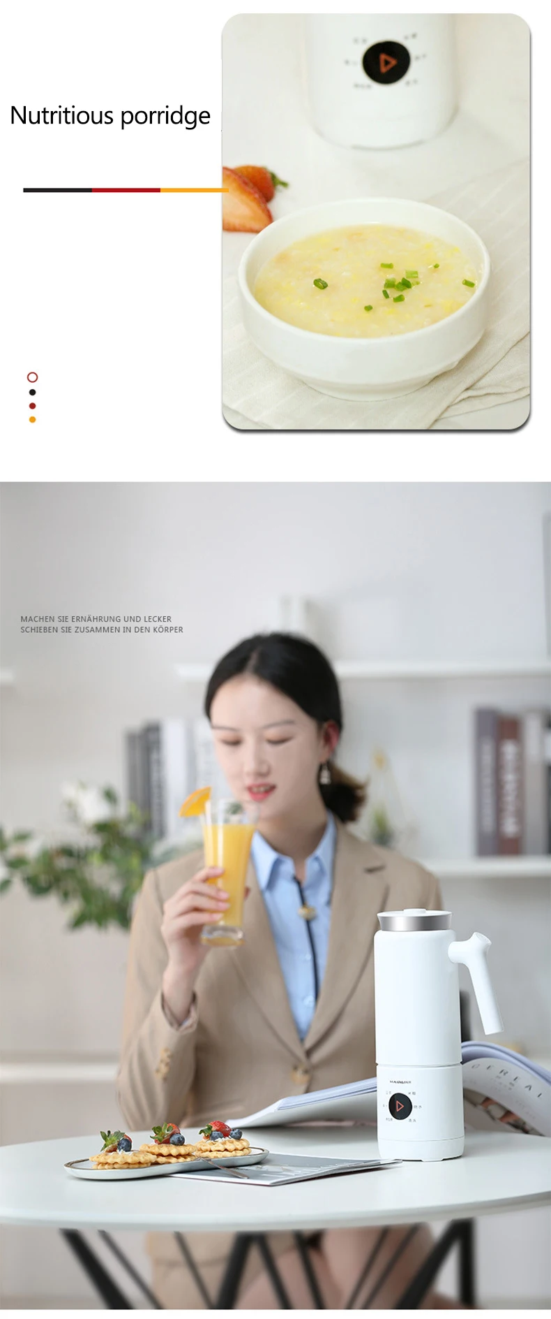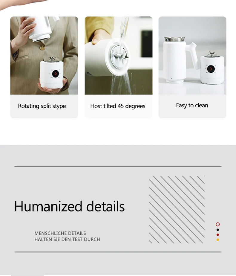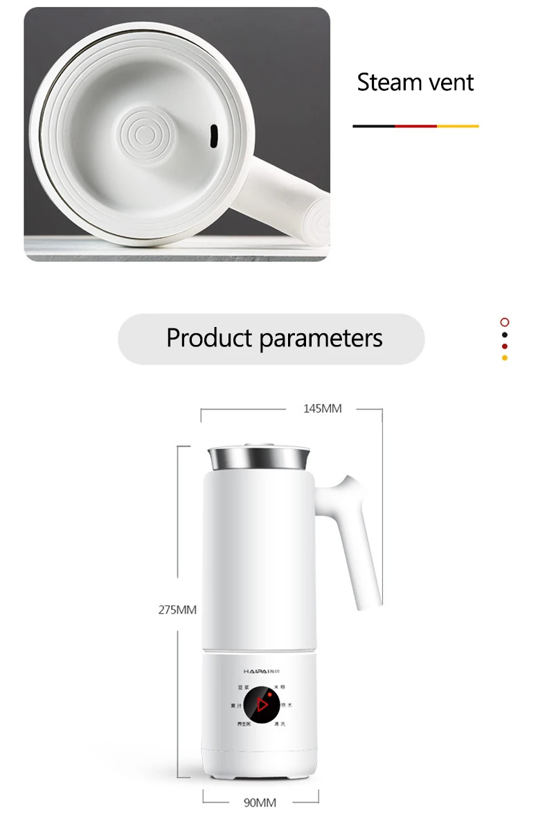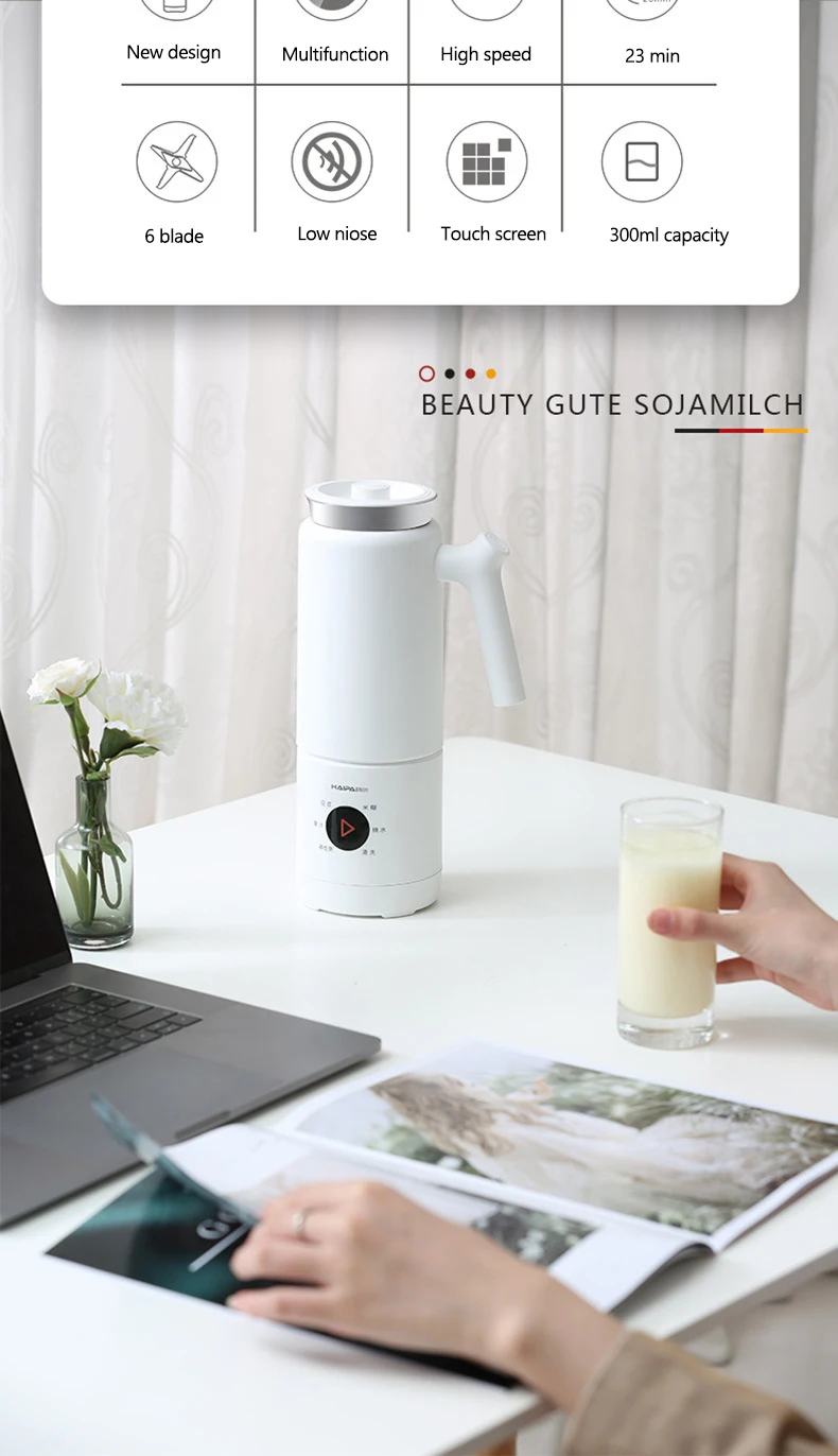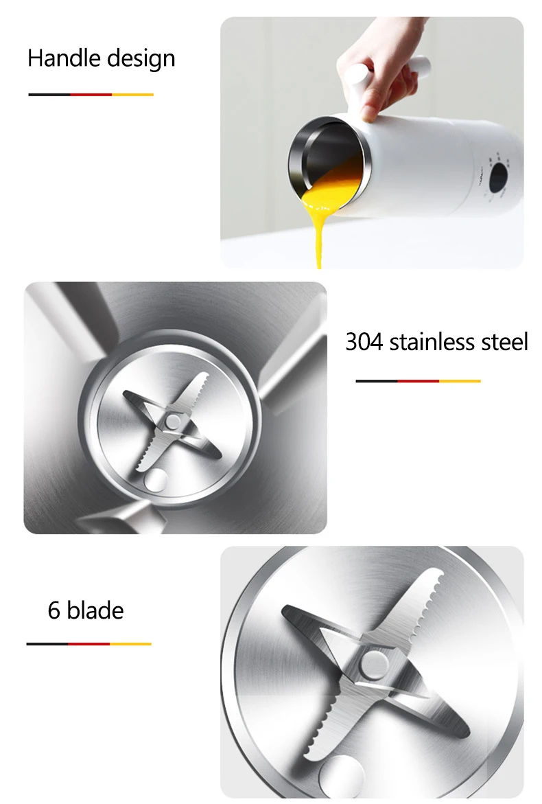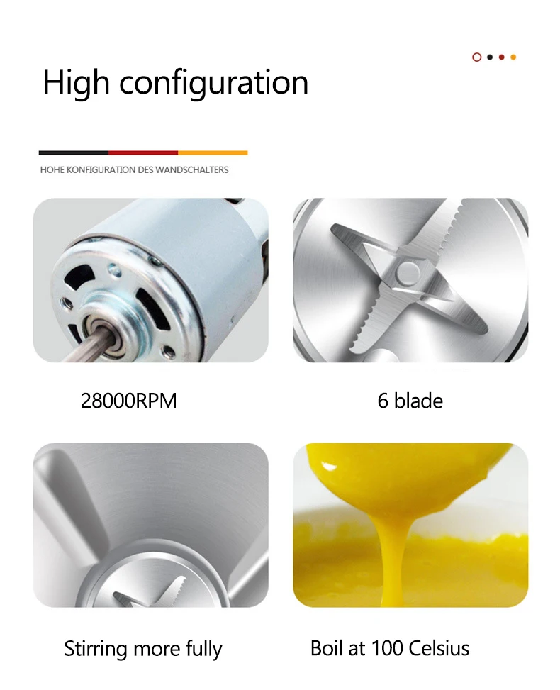 Напряжение: 220 В Мощность перемешивания: 90 Вт Мощность нагрева: 300 Вт Емкость: 300 мл Размер: 275*90 мм Скорость: 28000р/мин Посылка Вес: 1,5 кг Особенность 1: мини портативный, сплит-стиль Особенность 2: heatable Особенность 3: многофункциональный Особенность 4: бесплатный фильтр Характеристика 5: 6 лезвий из нержавеющей стали Особенность 6: Чистка одной кнопкой
