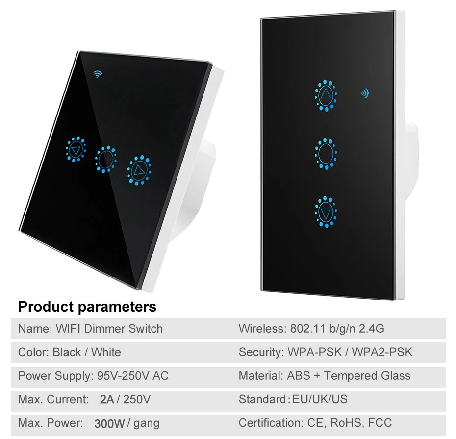 Название: смарт-переключатель WIFI Цвет: черный/белый Источник питания: 90-250 В переменного тока Макс. Ток: 2A / 250V Макс. Мощность: 300 Вт/комплект Беспроводная связь: 802,11 b/g/n 2,4G Безопасность: WPA-PSK / WPA2-PSK Материал: АБС + закаленное стекло Размер: ЕС/Великобритания: 86*86*34 мм/3,4*3,4*1,34 дюймов США: 120*76*34 мм/4,7*3*1,34 дюймов Сертификация: CE, RoHS, FCC