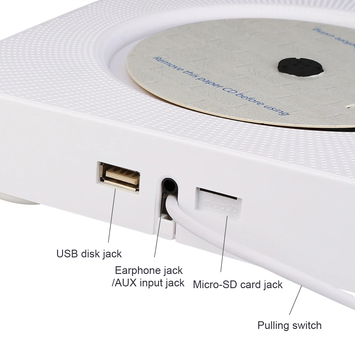 Настенный CD плеер, поддерживает CD/CD-R/CD-RW/MP3/WMA формат Mp3-плеер: можно воспроизводить любимую музыку на usb-диске или micro-SD карте Fm-радио: можно искать и хранить радиостанции Bluetooth-динамик: Подключите телефон или стол через Bluetooth для воспроизведения музыки AUX аудио вход: поддержка подключения внешнего аудио оборудования в качестве громкоговорителя С пультом дистанционного управления, дистанция дистанционного управления до 5 метров Креативный Настенный дизайн с выдвижным выключателем, облегчает установку на стенуСпецификация: