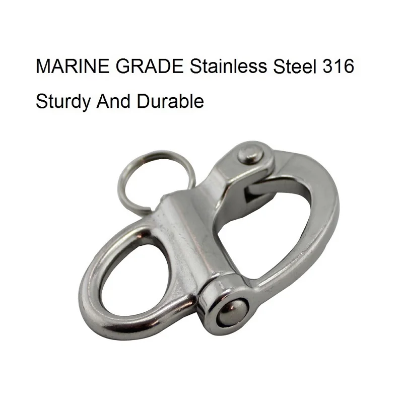 Материал: нержавеющая сталь 316 Поверхность: высокополированное Размер: 35 мм 52 мм 69 мм 96 мм Упаковка: 1 шт. Особенности: 1. Быстросъемный пружинный штырь и центральный шарнирный штырь 2. Плунжерное действие-легкое, широкоугольное открытие 3. Сверхпрочная конструкция из нержавеющей стали 304, полированная для гладкого внешнего вида 4. Вытяжное кольцо из нержавеющей стали и компактная поворотная головка тюка 5. Используется для дайвинга, серфинга, веревки для выживания на открытом воздухе
