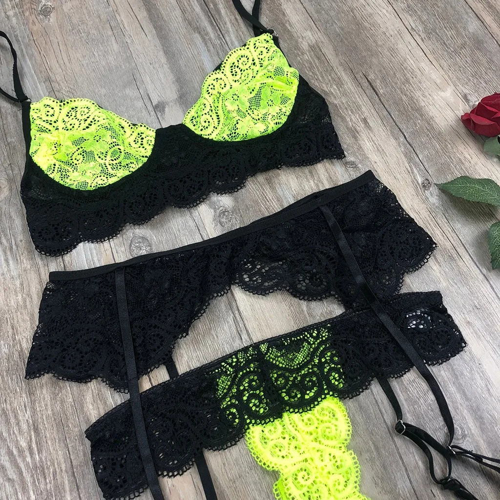 3 шт., женское кружевное сексуальное нижнее белье, беспроводной бюстгальтер + трусики, Комплект подвязок, нижнее белье, Babydoll