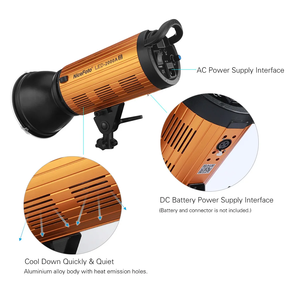 Dual Power Supply: For indoor use, you can connect the power supply directly with the power cord; For outdoor use, you can connect the compatible battery through the NiceFoto BP-V01 battery holder and cable (Not included).