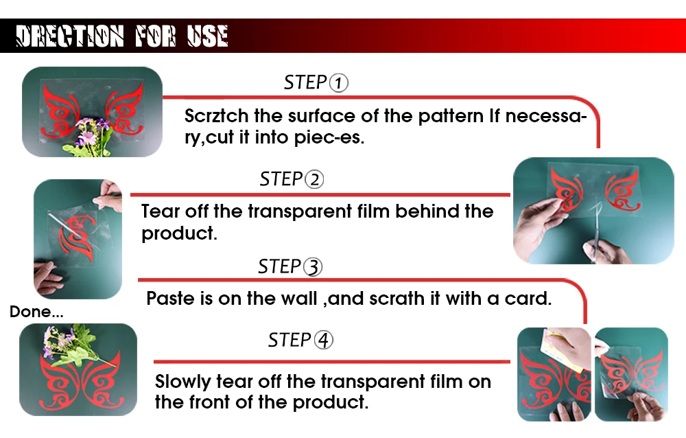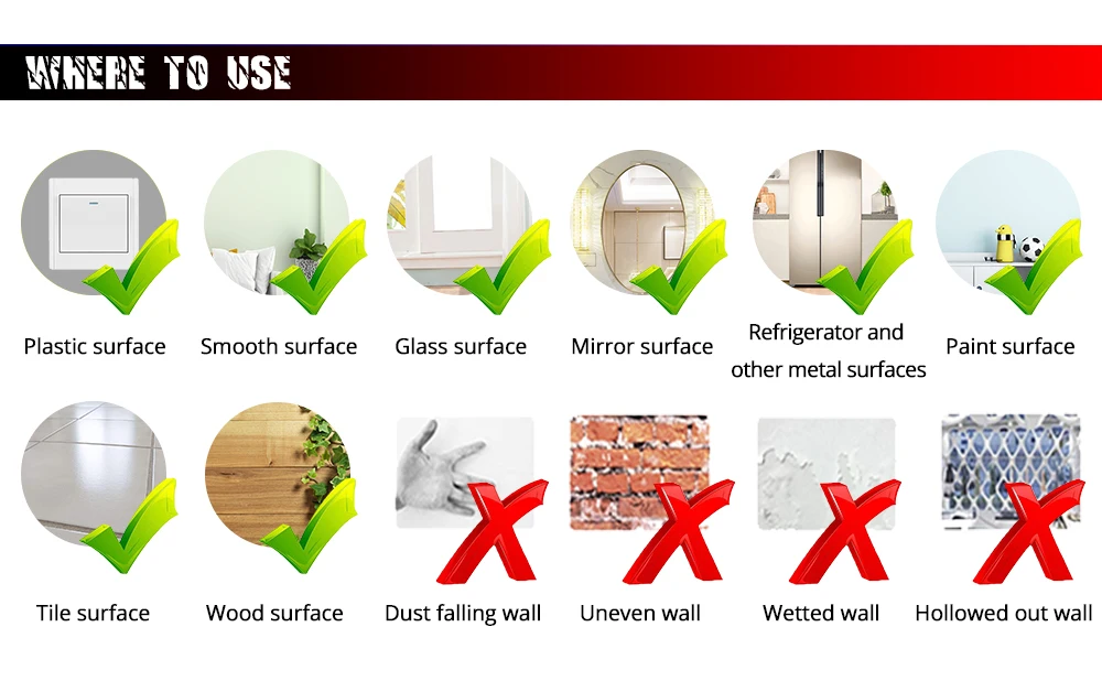 4. Место: Подходит для любой плоской поверхности, такой как мебель очки полы стены зеркала автомобилей Baots велосипеды дерево пластик металл.