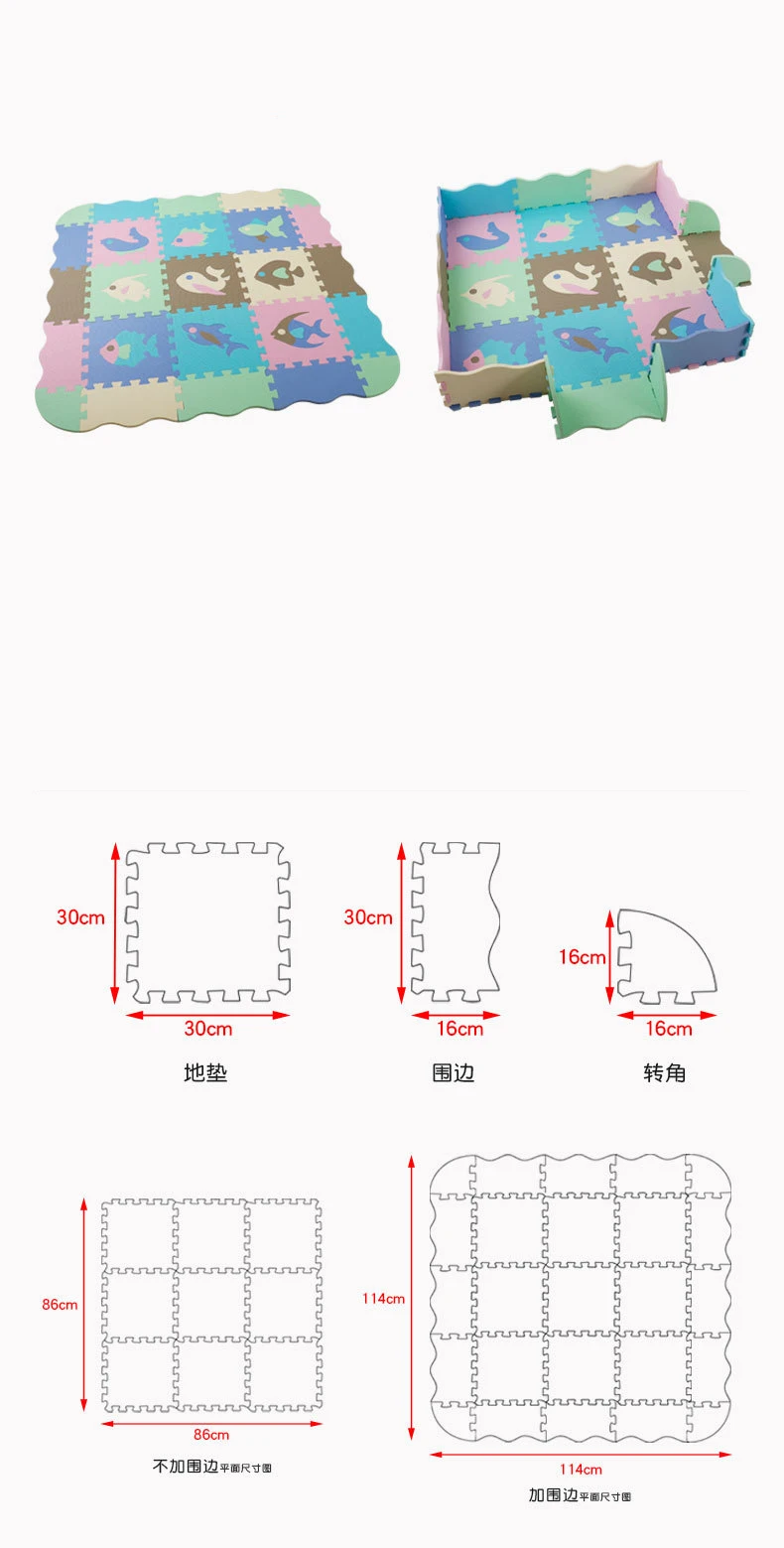 Название: напольный коврик пазл Материал: материал защиты окружающей среды EVA Размер плитки: 86*86*1 см Подходящий возраст: ребенок старше 2 месяцев Упаковка: Экологически чистая термоусадочная пленка Размер упаковки: 30*30*9 см Количество товаров: 9 штук напольного коврика Вес продукта: 0,55 кг