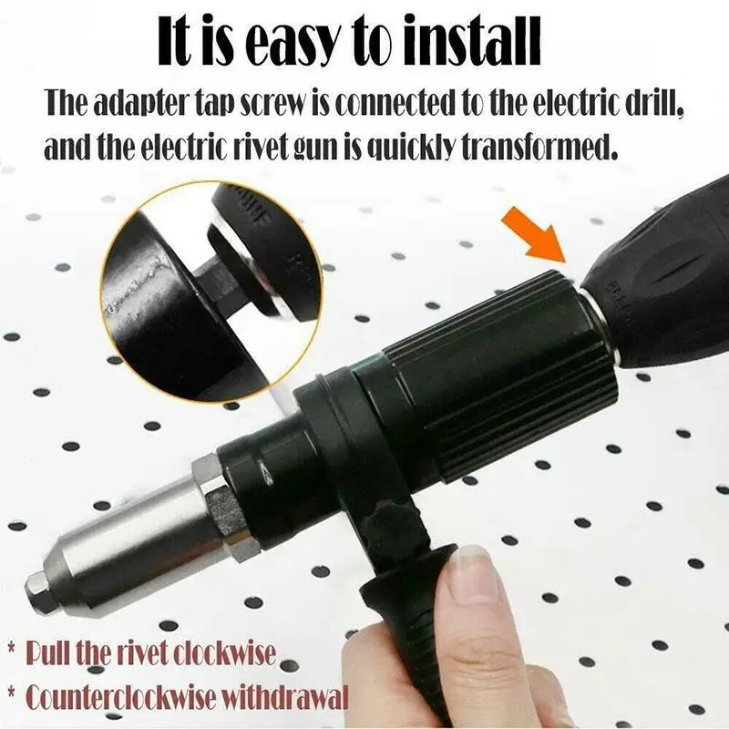 Заклепочный пистолет-адаптер легко устанавливается и отсоединяется самостоятельно, не требует сложного процесса и других инструментов для установки. По часовой стрелке для установки, против часовой стрелки для отсоединения.